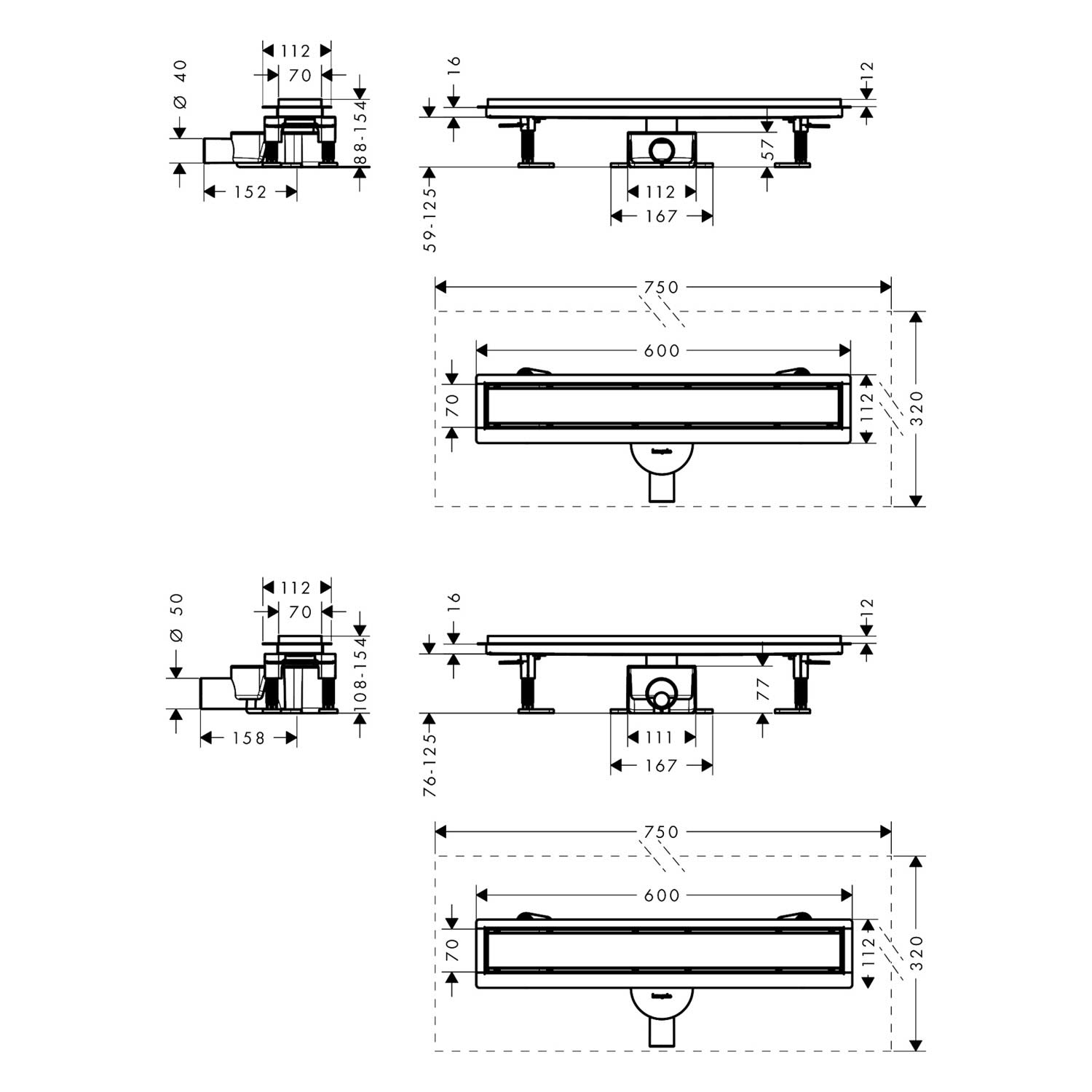 hansgrohe RainDrain Go Komplettset Duschrinne 600 rückseitig befliesbar für Standard-/flache Installation