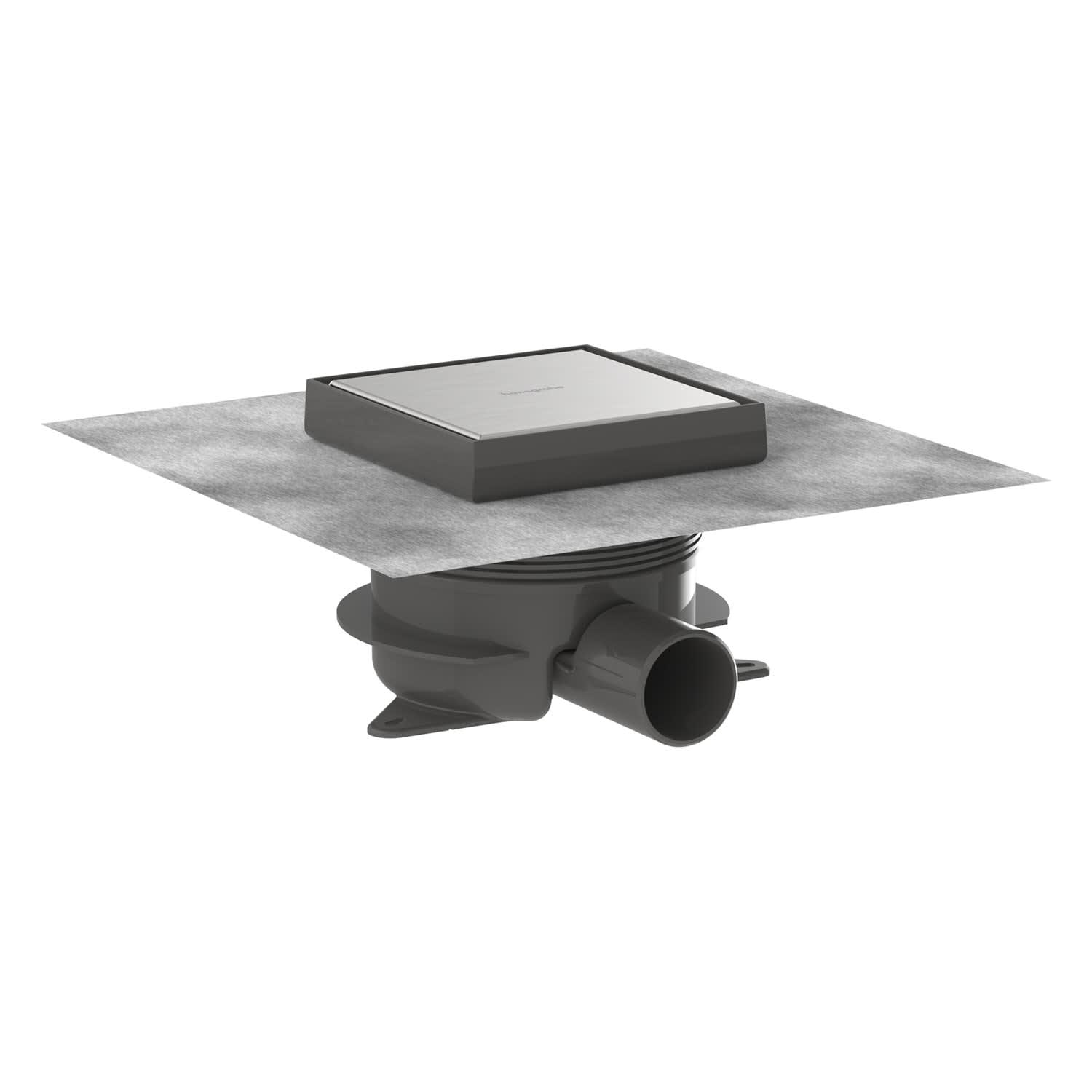 - Designabdeckung, Grundkörper, Siphon, werkseitig vormontiertes Dichtvlies, Bauschutzkappe