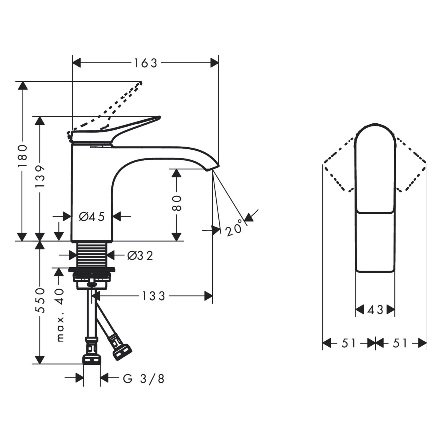 - einfache Installation: die Armatur wird über flexible Anschlussschläuche (G 3/8) mit den Wasseranschlüssen verbunden (Größe: DN15)
