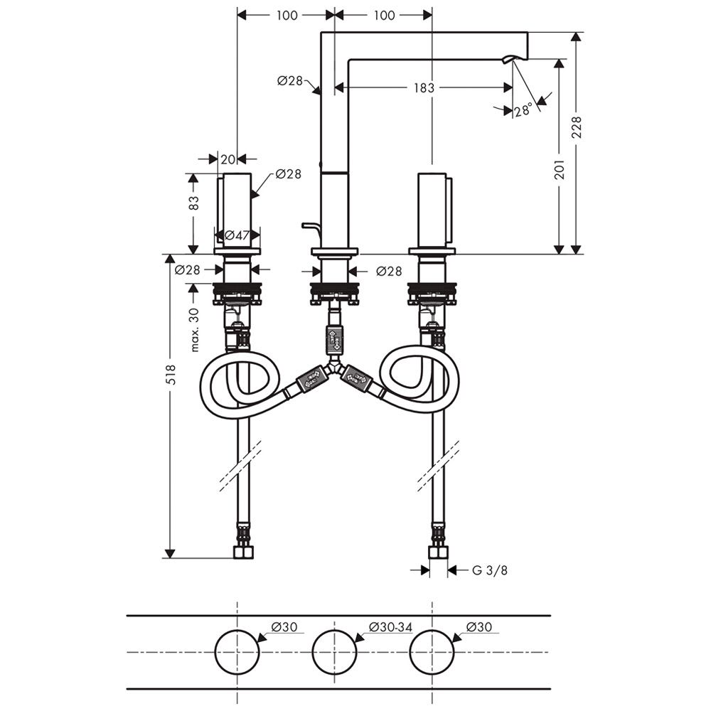 AXOR Uno 3-Loch Waschtischmischer 200 mit Zerogriff und Ablaufgarnitur