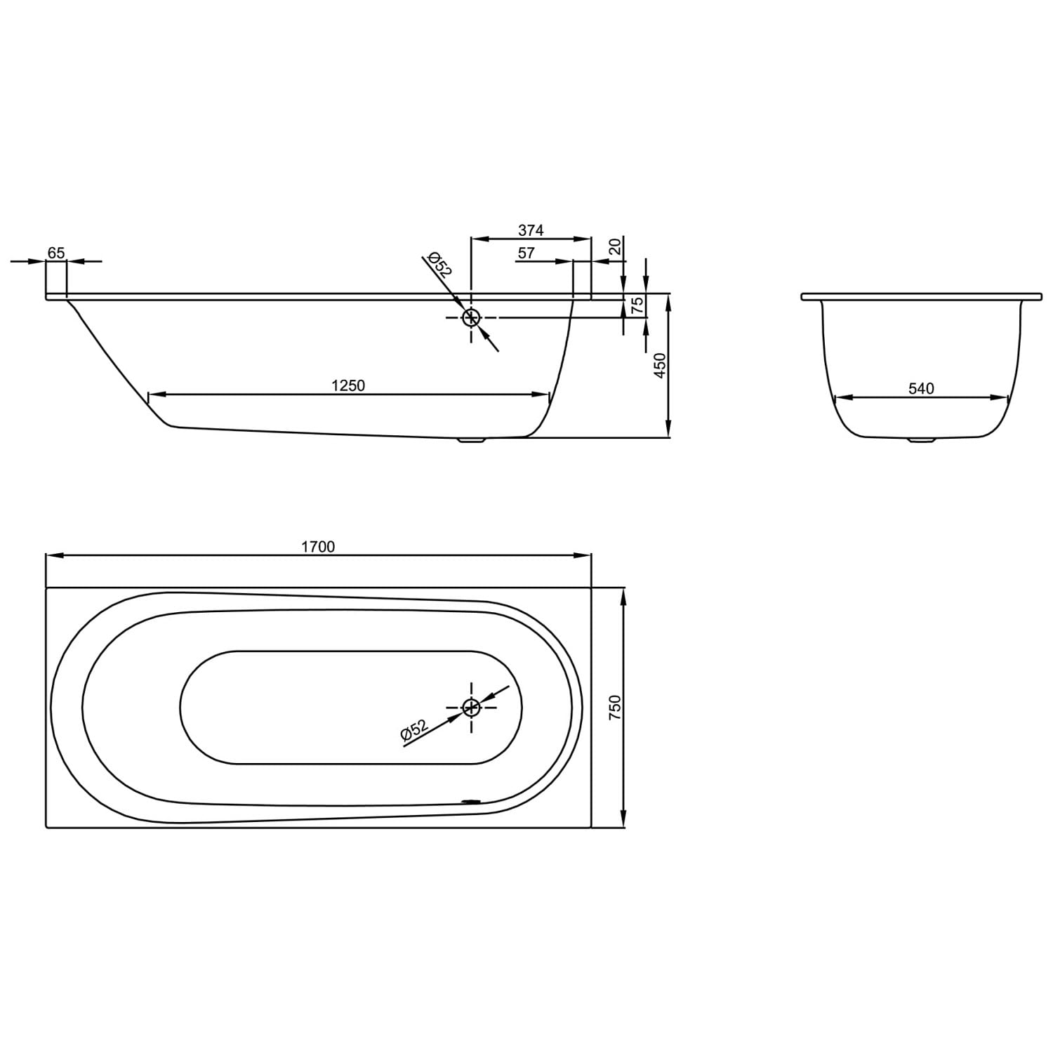 Bette Comodo Rechteck-Badewanne 170 x 75 cm, Überlauf vorne