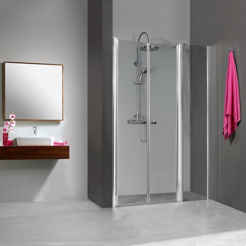 Einfach zu reinigen und auch in kleineren Bädern sehr praktisch sind die Pendeltüren mit Festteil, die sich hervorragend als Nischenlösung nutzen lassen.