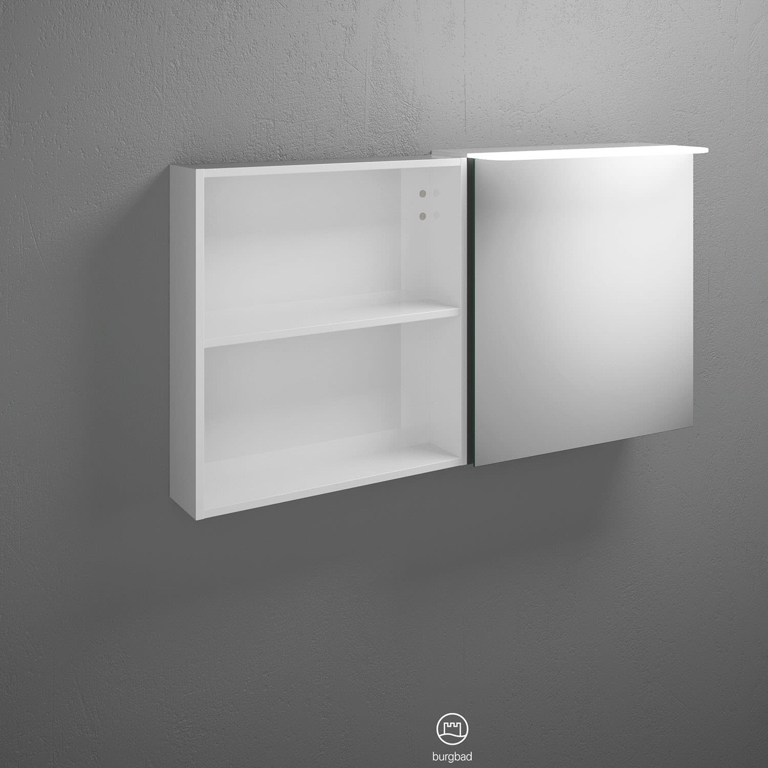 burgbad Badu Spiegelschrank mit LED-Aufsatzleuchte 120 cm, 1 Spiegeltür links, 1 Regal rechts