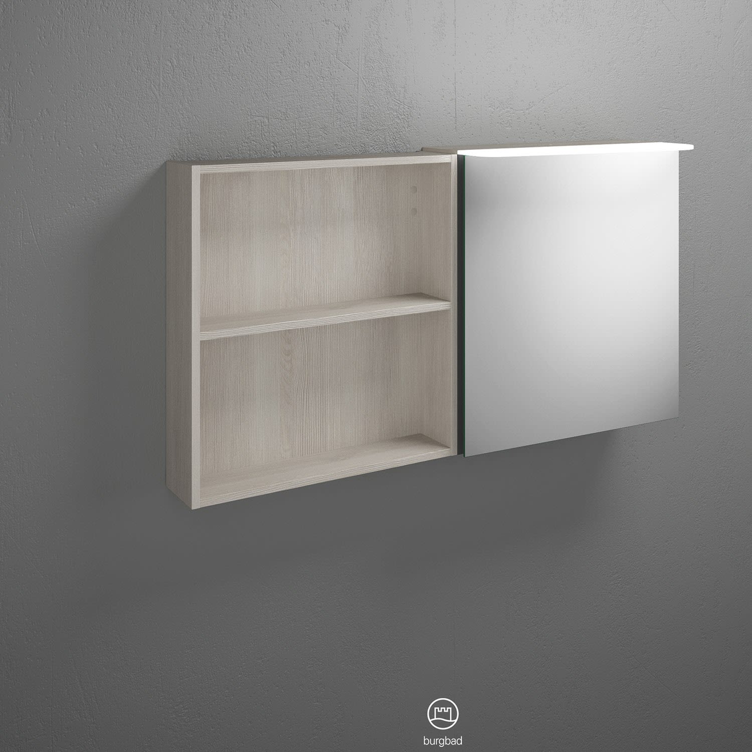 burgbad Badu Spiegelschrank mit LED-Aufsatzleuchte 120 cm, 1 Spiegeltür links, 1 Regal rechts
