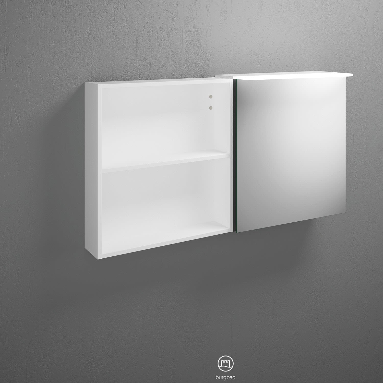 burgbad Badu Spiegelschrank mit LED-Aufsatzleuchte 120 cm, 1 Spiegeltür rechts, 1 Regal links