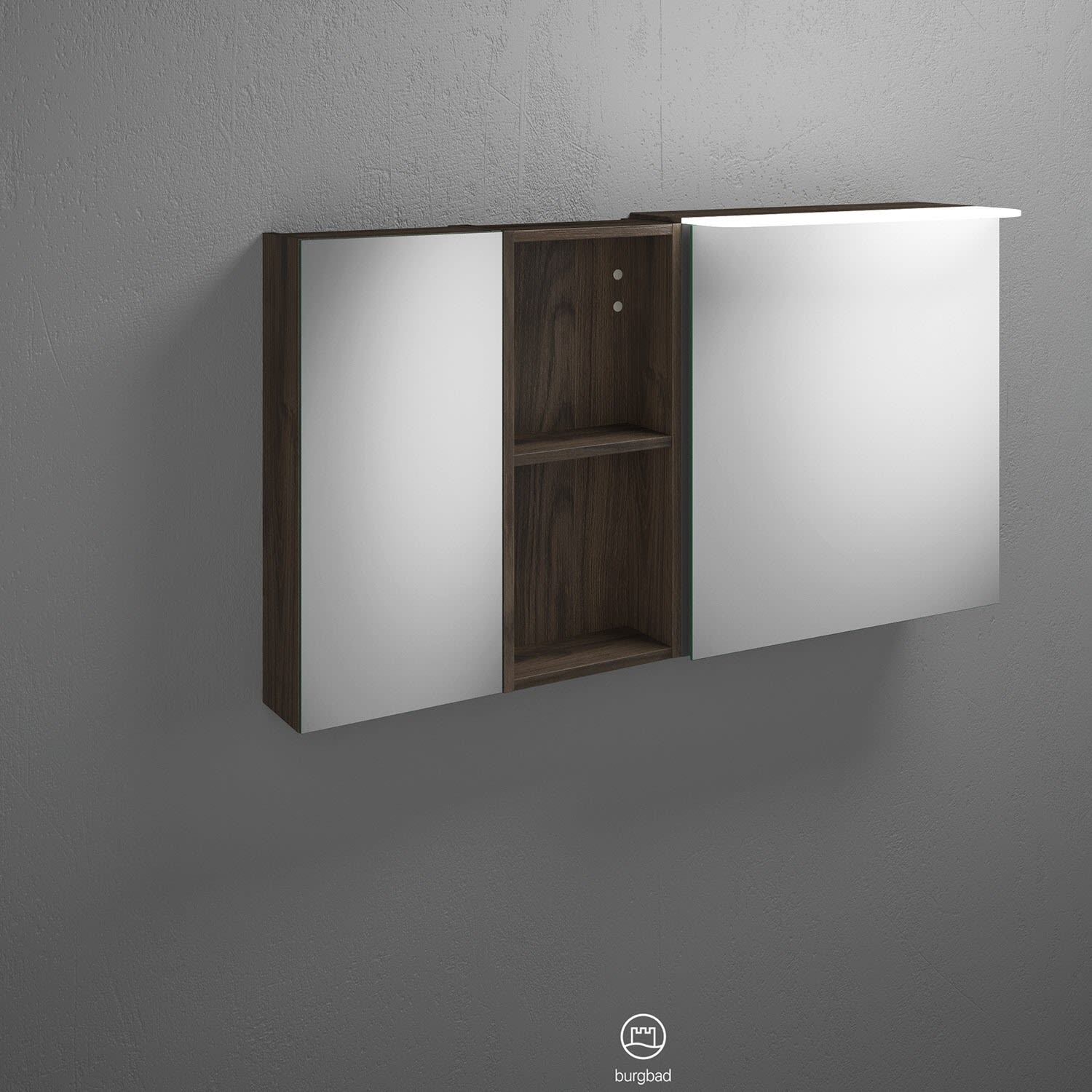 burgbad Badu Spiegelschrank mit LED-Aufsatzleuchte 120 cm, 2 Spiegeltüren, 1 Regal, Version links
