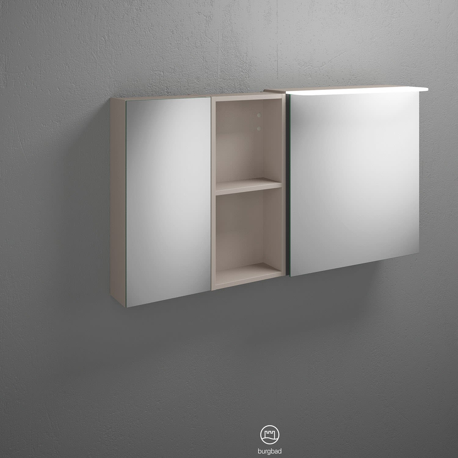 burgbad Badu Spiegelschrank mit LED-Aufsatzleuchte 120 cm, 2 Spiegeltüren, 1 Regal, Version rechts