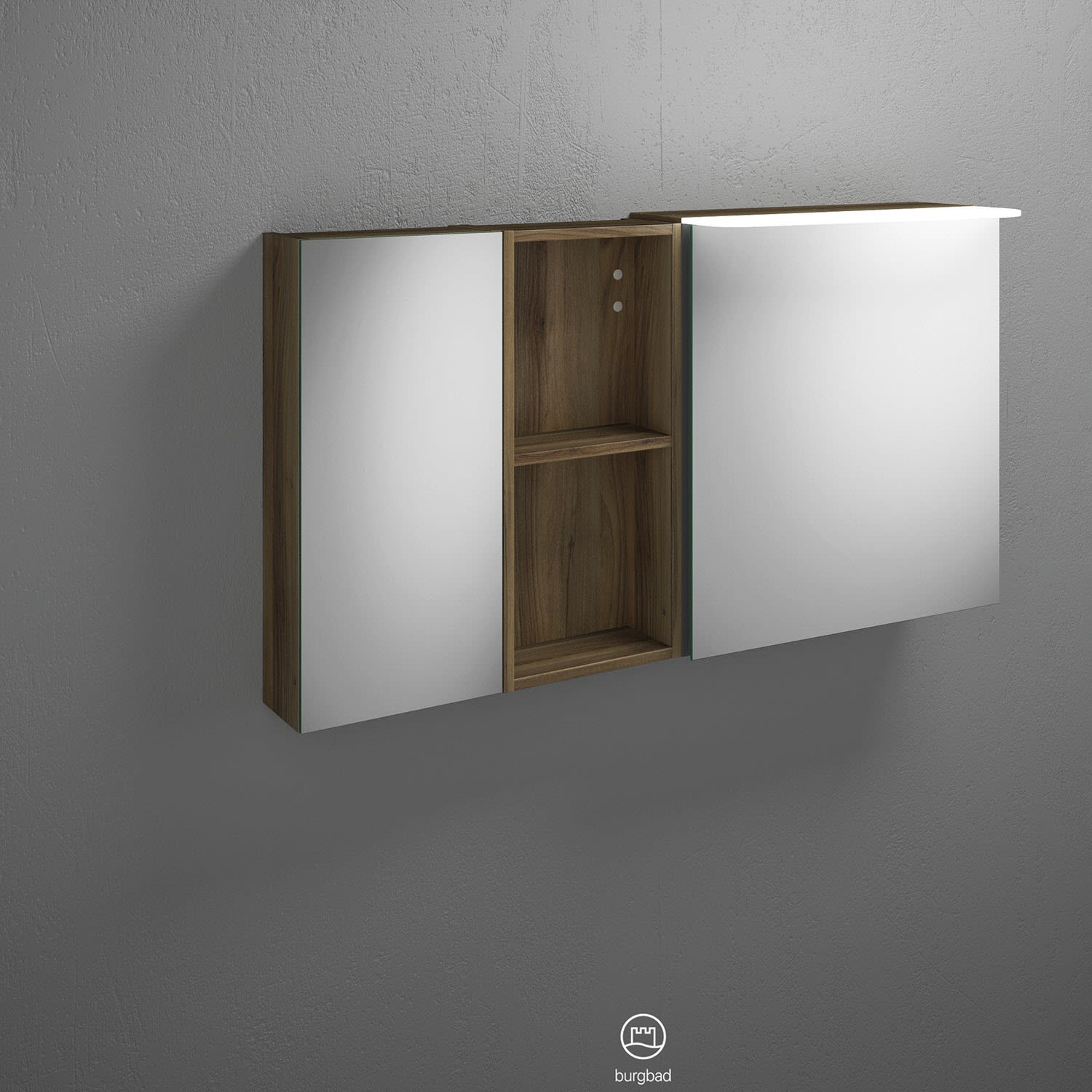burgbad Badu Spiegelschrank mit LED-Aufsatzleuchte 120 cm, 2 Spiegeltüren, 1 Regal, Version rechts