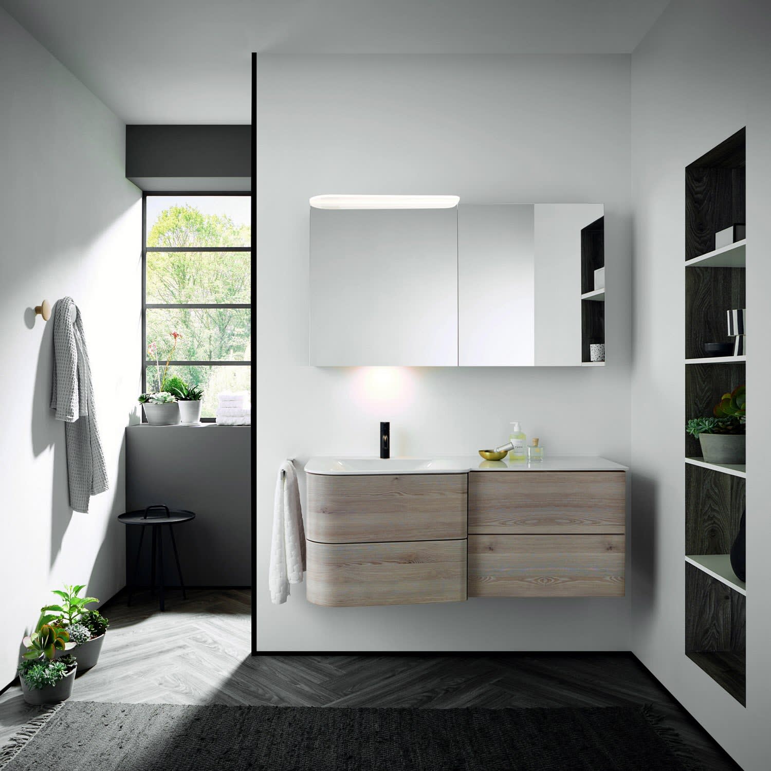 burgbad Badu Spiegelschrank mit LED-Aufsatzleuchte 120 cm, 2 Spiegeltüren inkl. LED-Waschtischbeleutung, Version links