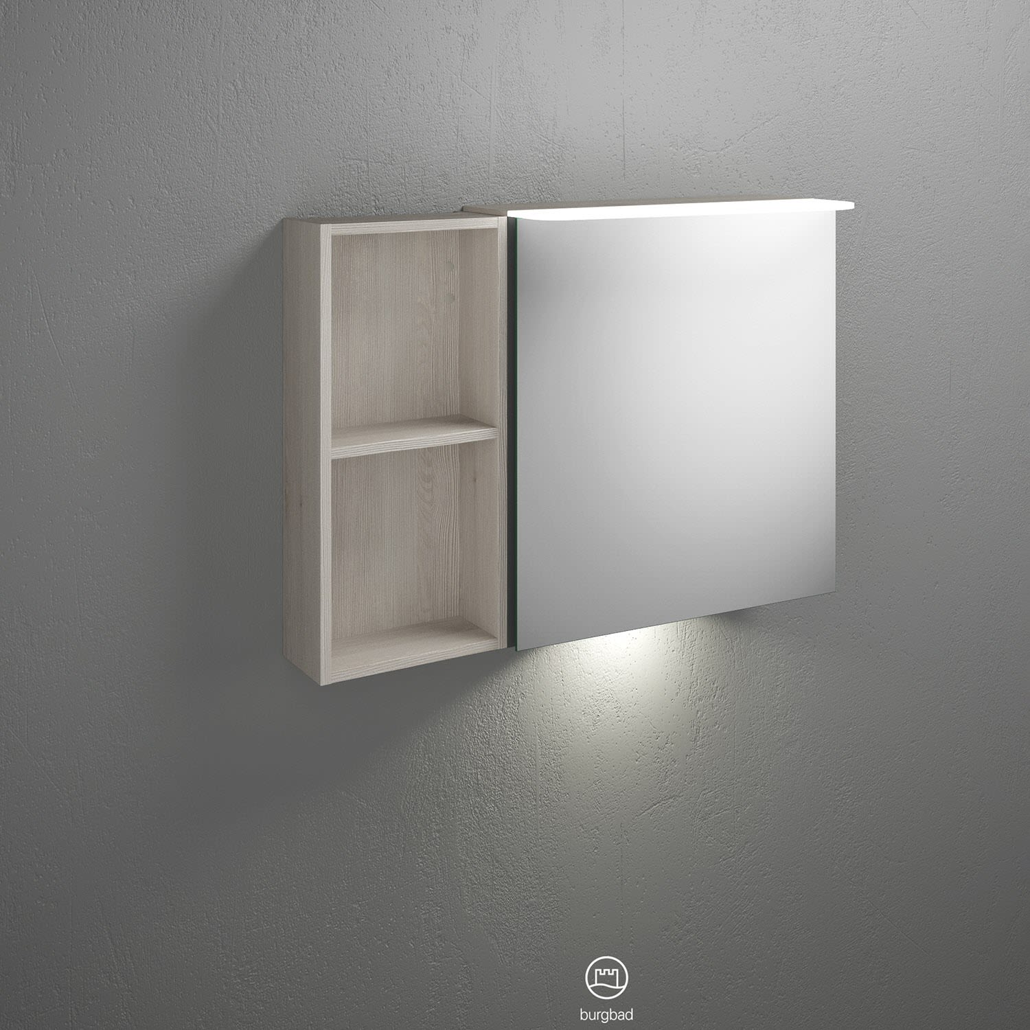 burgbad Badu Spiegelschrank mit LED-Aufsatzleuchte 90 cm, 1 Spiegeltür rechts, Regal links inkl. LED-Waschtischbeleuchtung