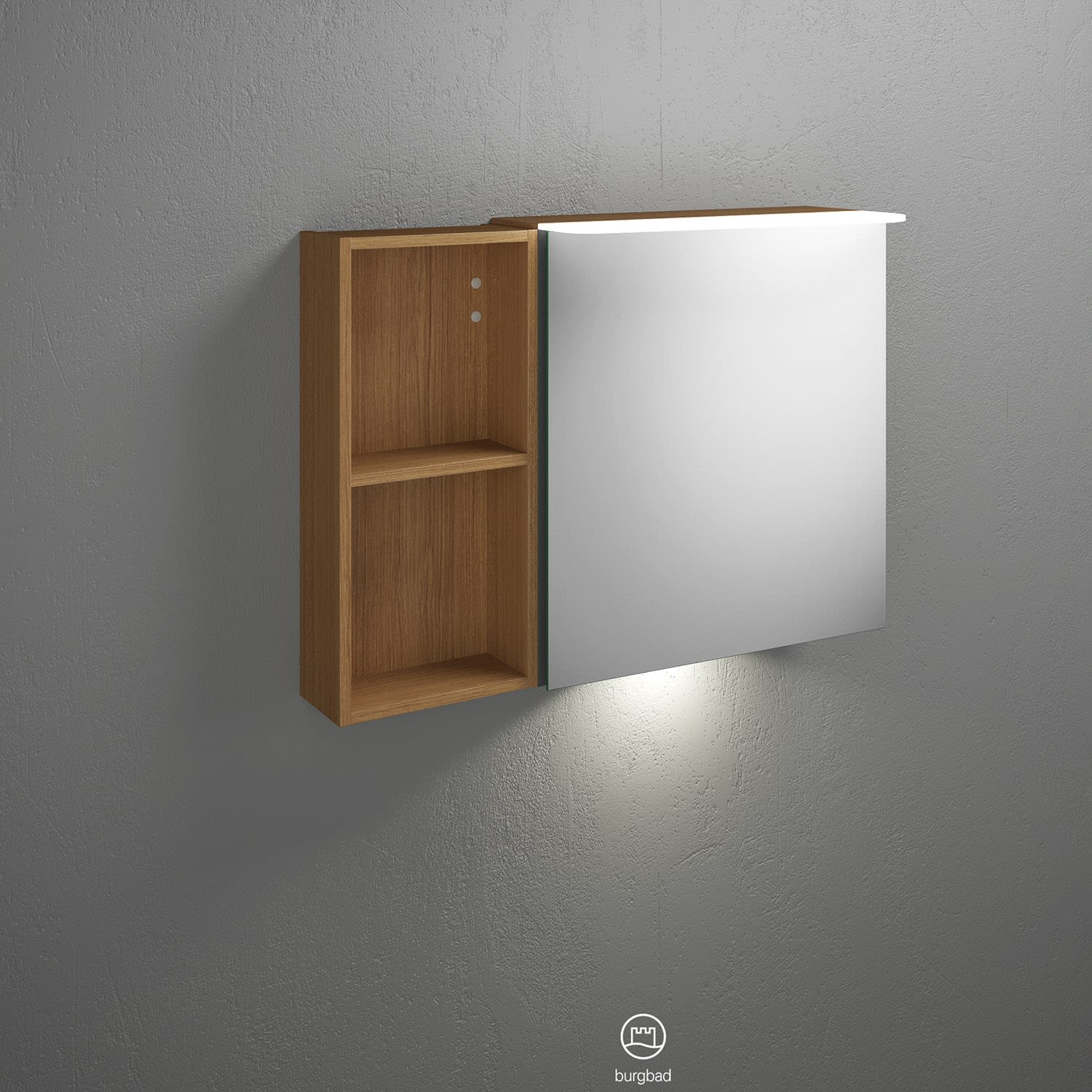 burgbad Badu Spiegelschrank mit LED-Aufsatzleuchte 90 cm, 1 Spiegeltür rechts, Regal links inkl. LED-Waschtischbeleuchtung