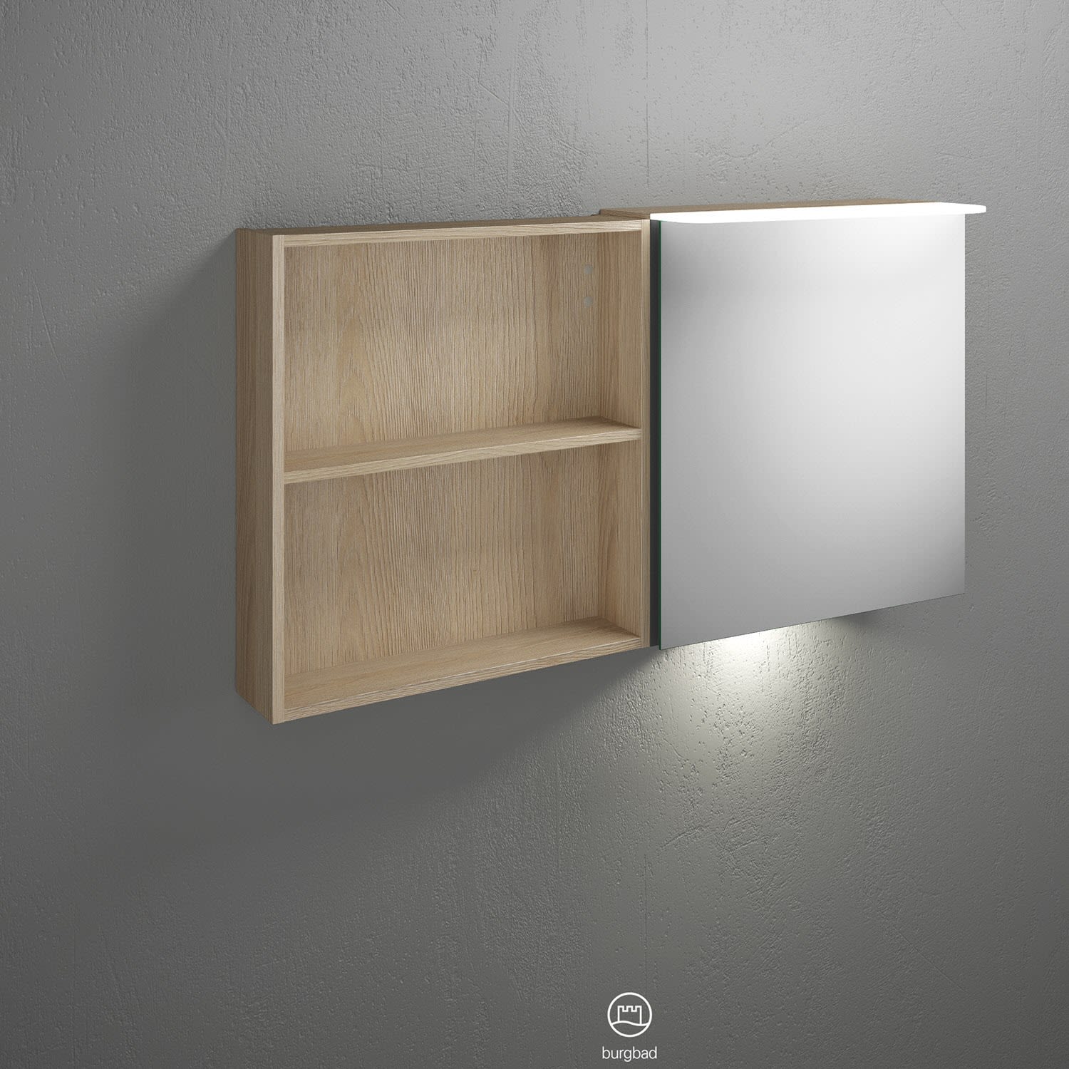 burgbad Badu Spiegelschrank mit LED-Aufsatzleuchte 120 cm, 1 Spiegeltür links, 1 Regal rechts inkl. LED-Waschtischbeleuchtung