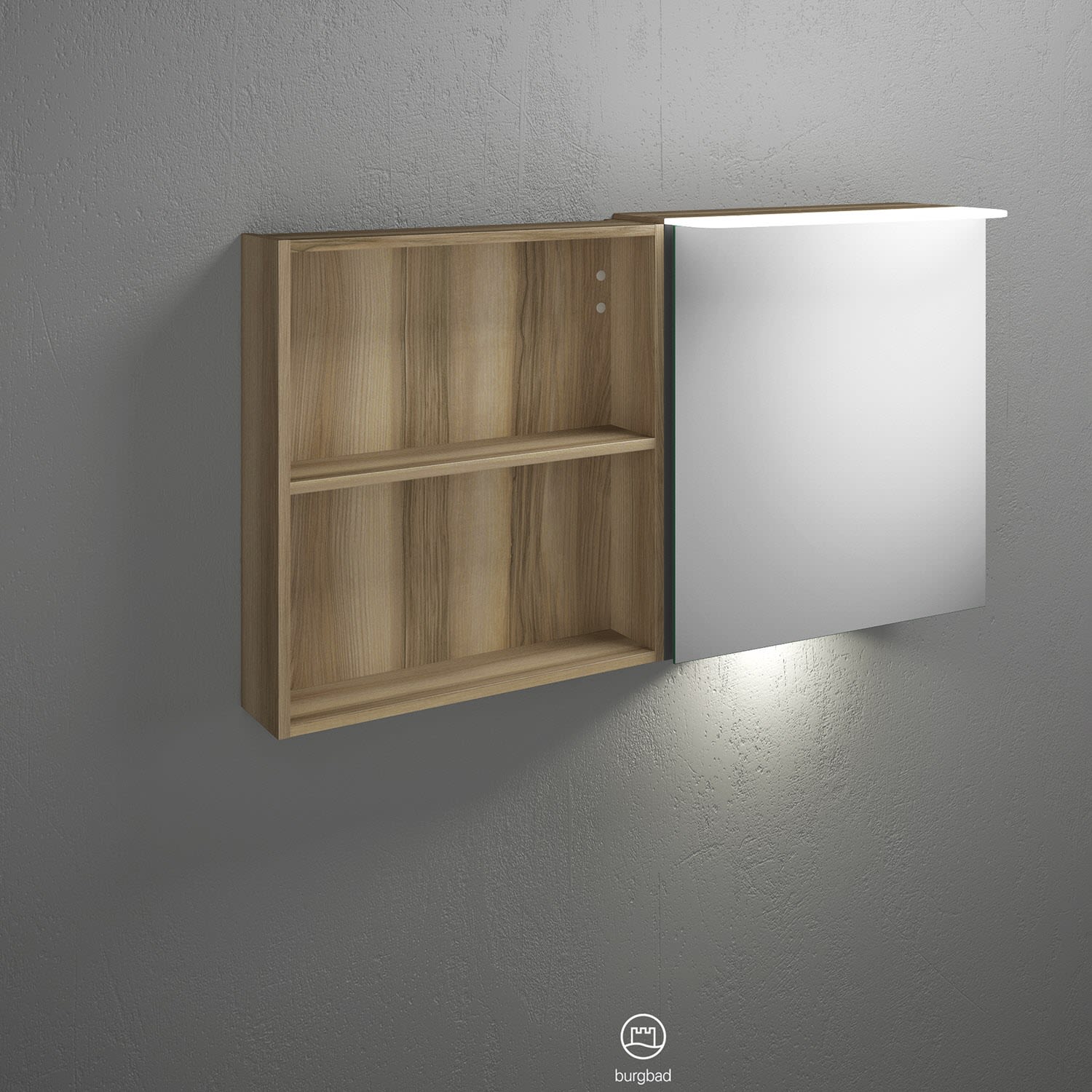 burgbad Badu Spiegelschrank mit LED-Aufsatzleuchte 120 cm, 1 Spiegeltür links, 1 Regal rechts inkl. LED-Waschtischbeleuchtung