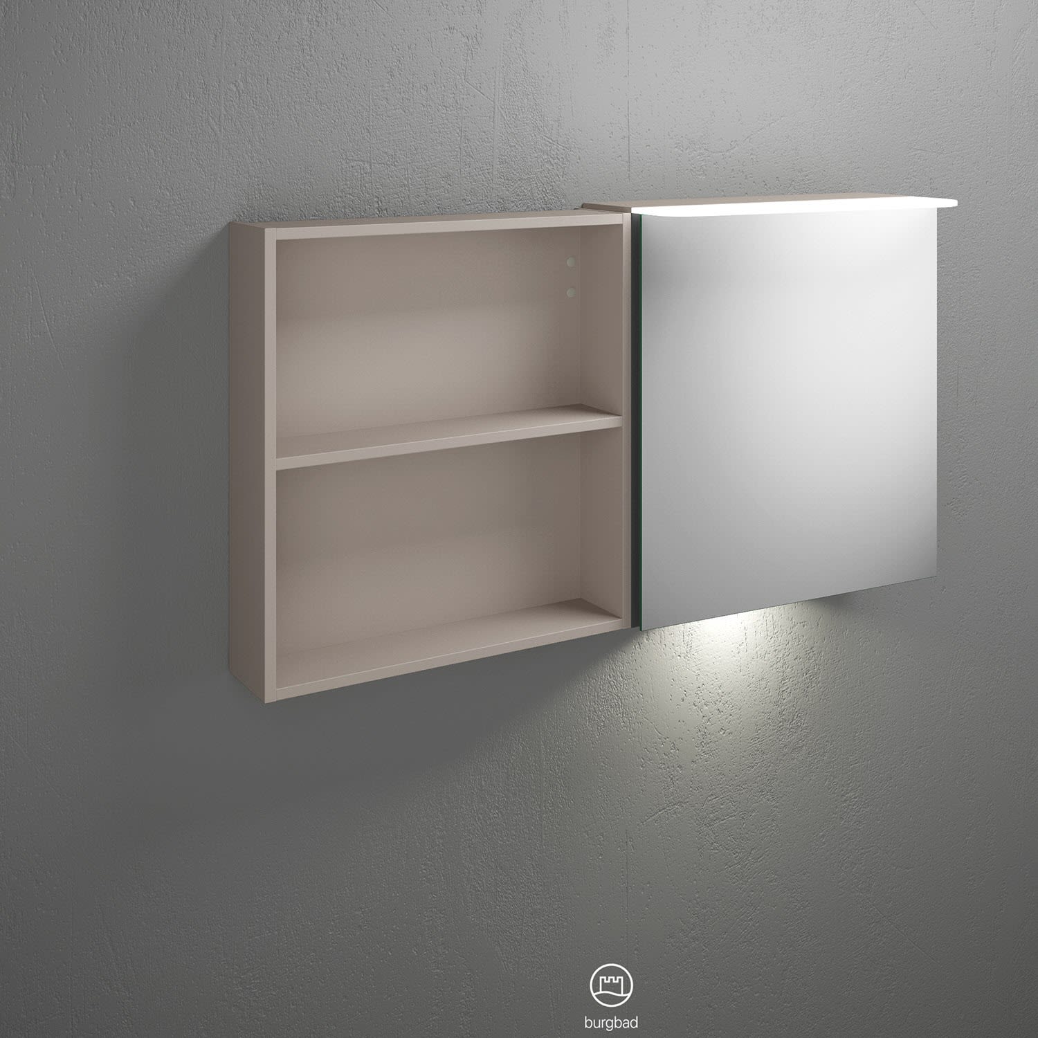 burgbad Badu Spiegelschrank mit LED-Aufsatzleuchte 120 cm, 1 Spiegeltür rechts, 1 Regal links inkl. LED-Waschtischbeleuchtung