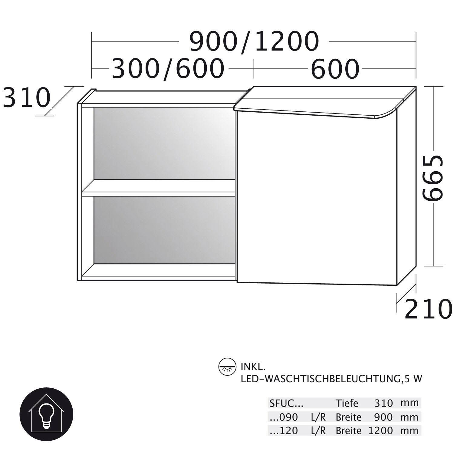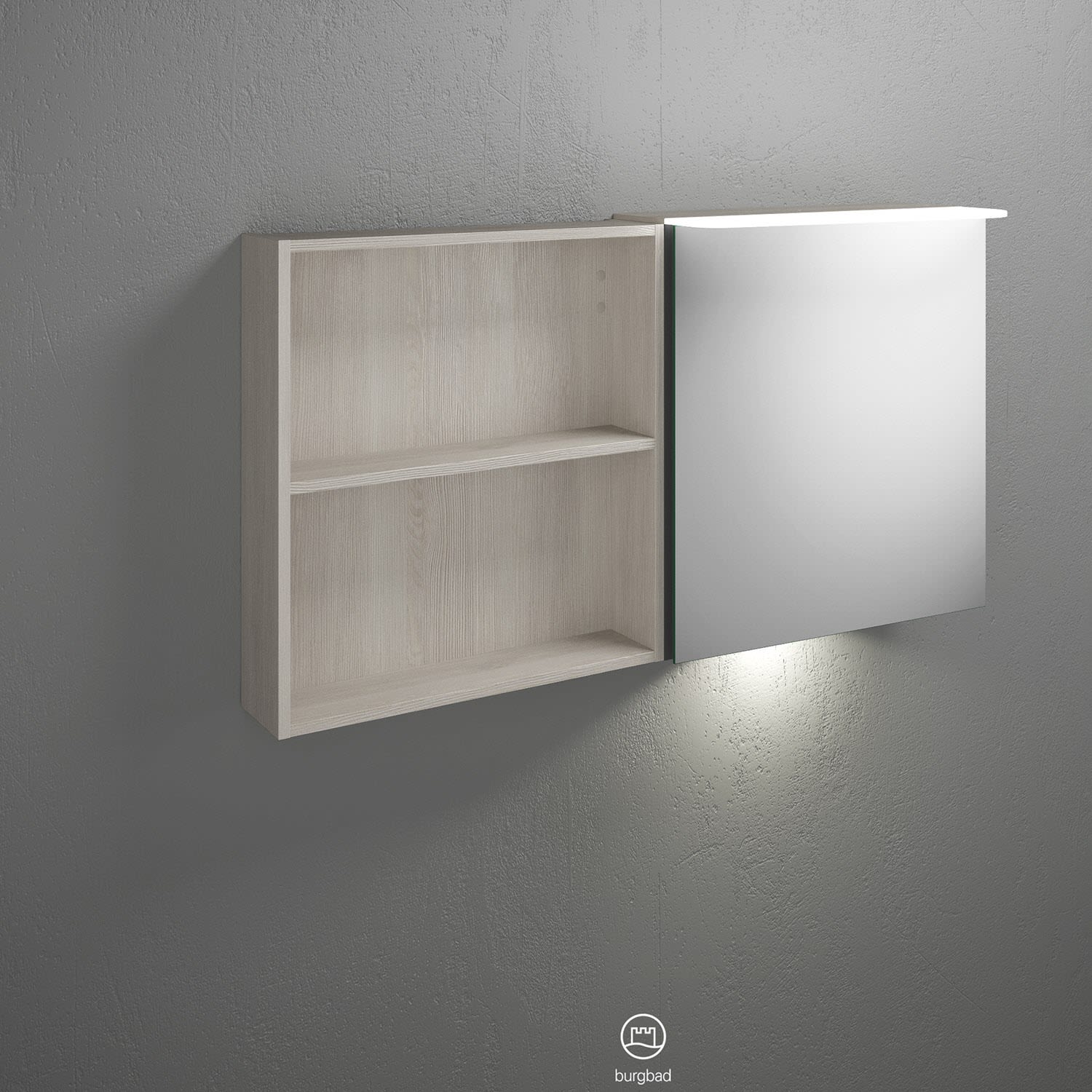 burgbad Badu Spiegelschrank mit LED-Aufsatzleuchte 120 cm, 1 Spiegeltür rechts, 1 Regal links inkl. LED-Waschtischbeleuchtung