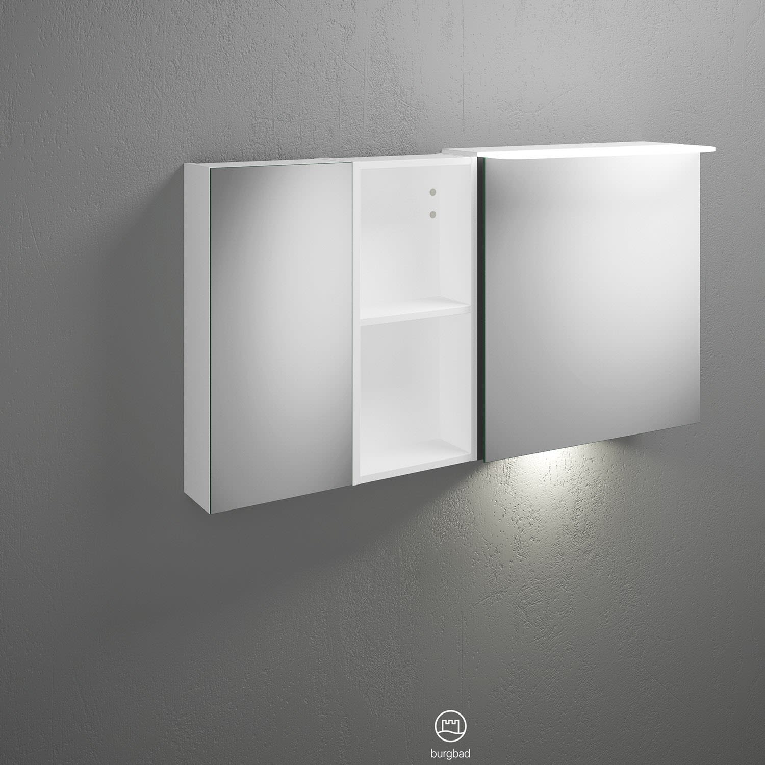 burgbad Badu Spiegelschrank mit LED-Aufsatzleuchte 120 cm, 2 Spiegeltüren, 1 Regal inkl. LED-Waschtischbeleuchtung, Version rechts