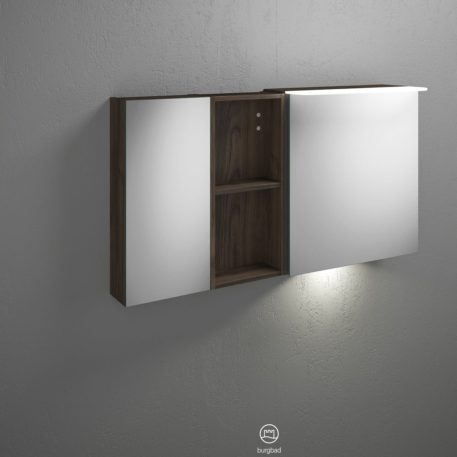 burgbad Badu Spiegelschrank mit LED-Aufsatzleuchte 120 cm, 2 Spiegeltüren, 1 Regal inkl. LED-Waschtischbeleuchtung, Version rechts