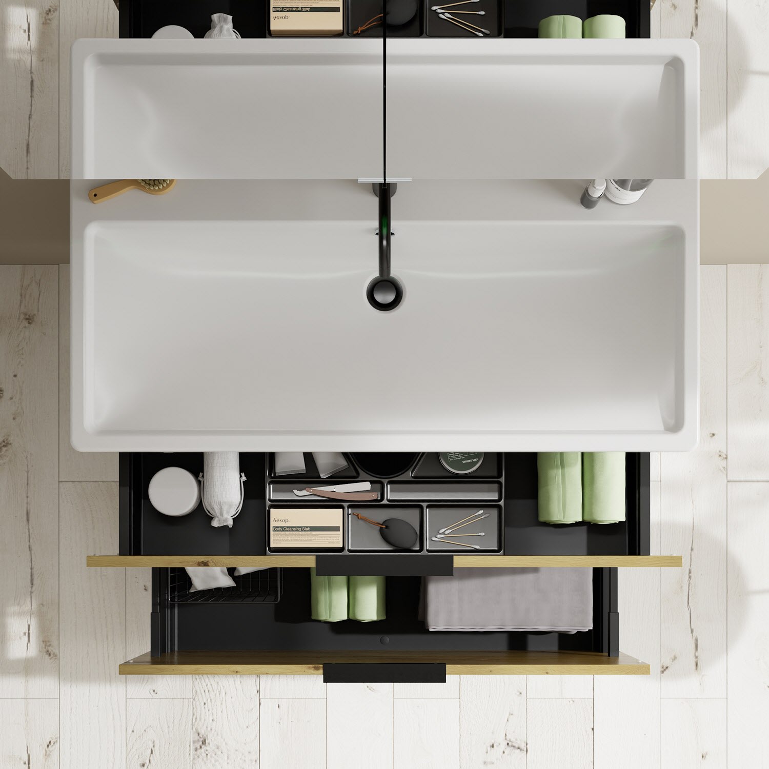 - 1 Schublade oben mit Siphonausschnitt und Inneneinteilung