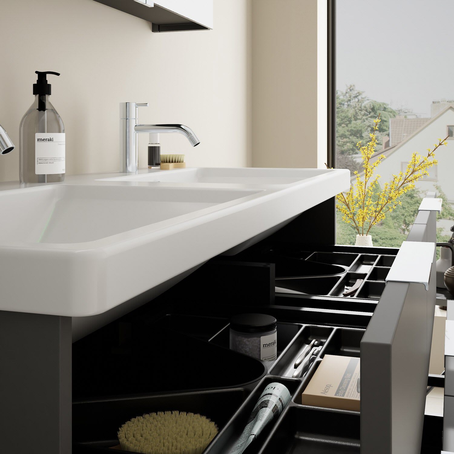 - 2 Schubladen oben mit Siphonausschnitt und Inneneinteilung