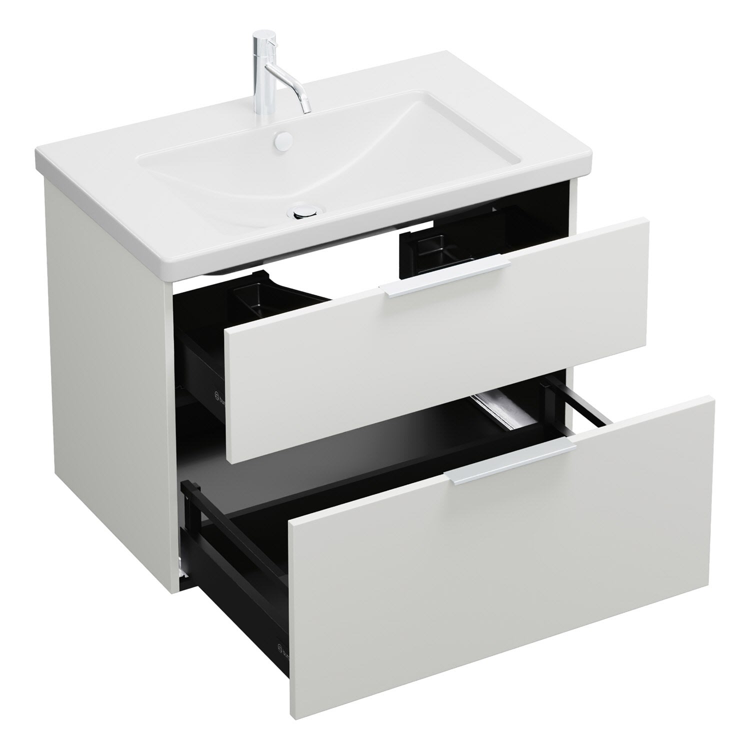 - 1 Schublade oben, 35 cm tief, mit Siphonausschnitt und Inneneinteilung