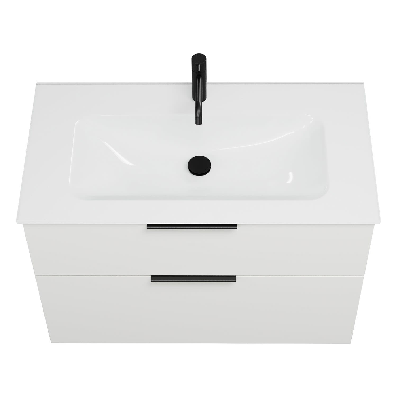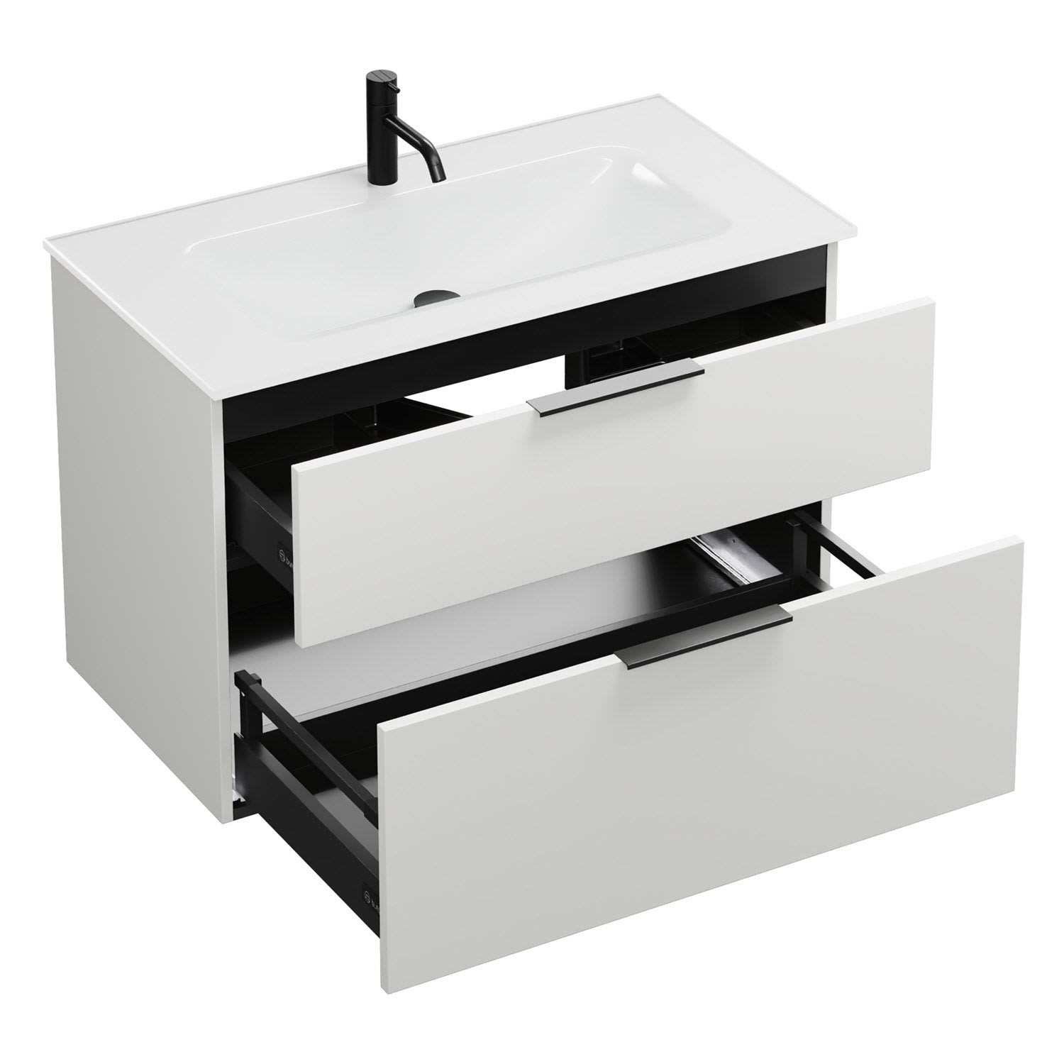 - 1 Schublade oben, 35 cm tief, mit Siphonausschnitt und Inneneinteilung