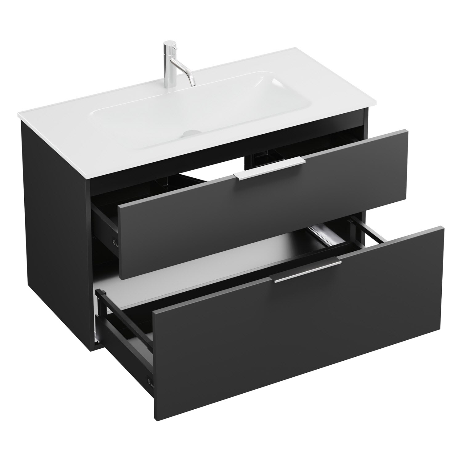 - 1 Schublade oben, 35 cm tief, mit Siphonausschnitt und Inneneinteilung