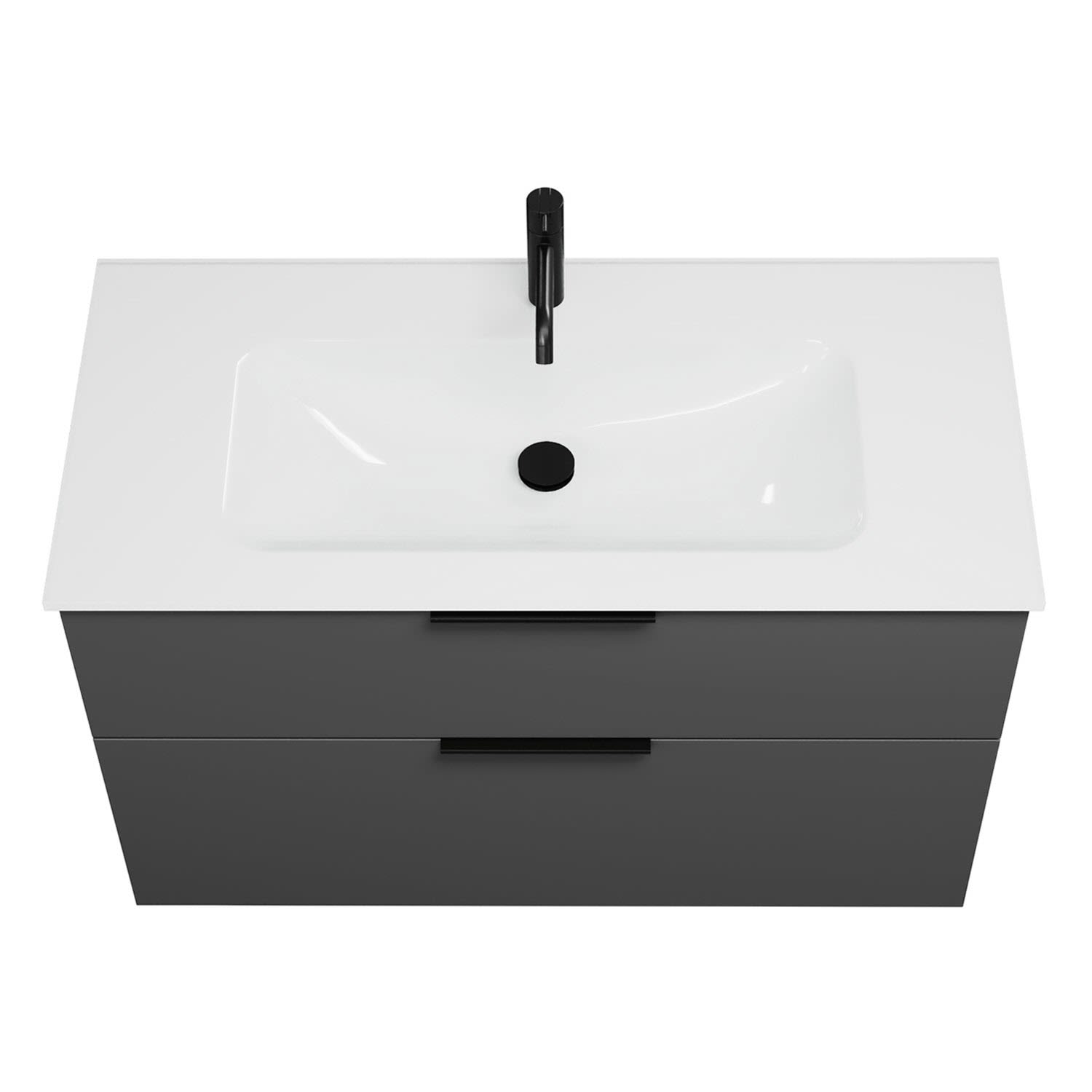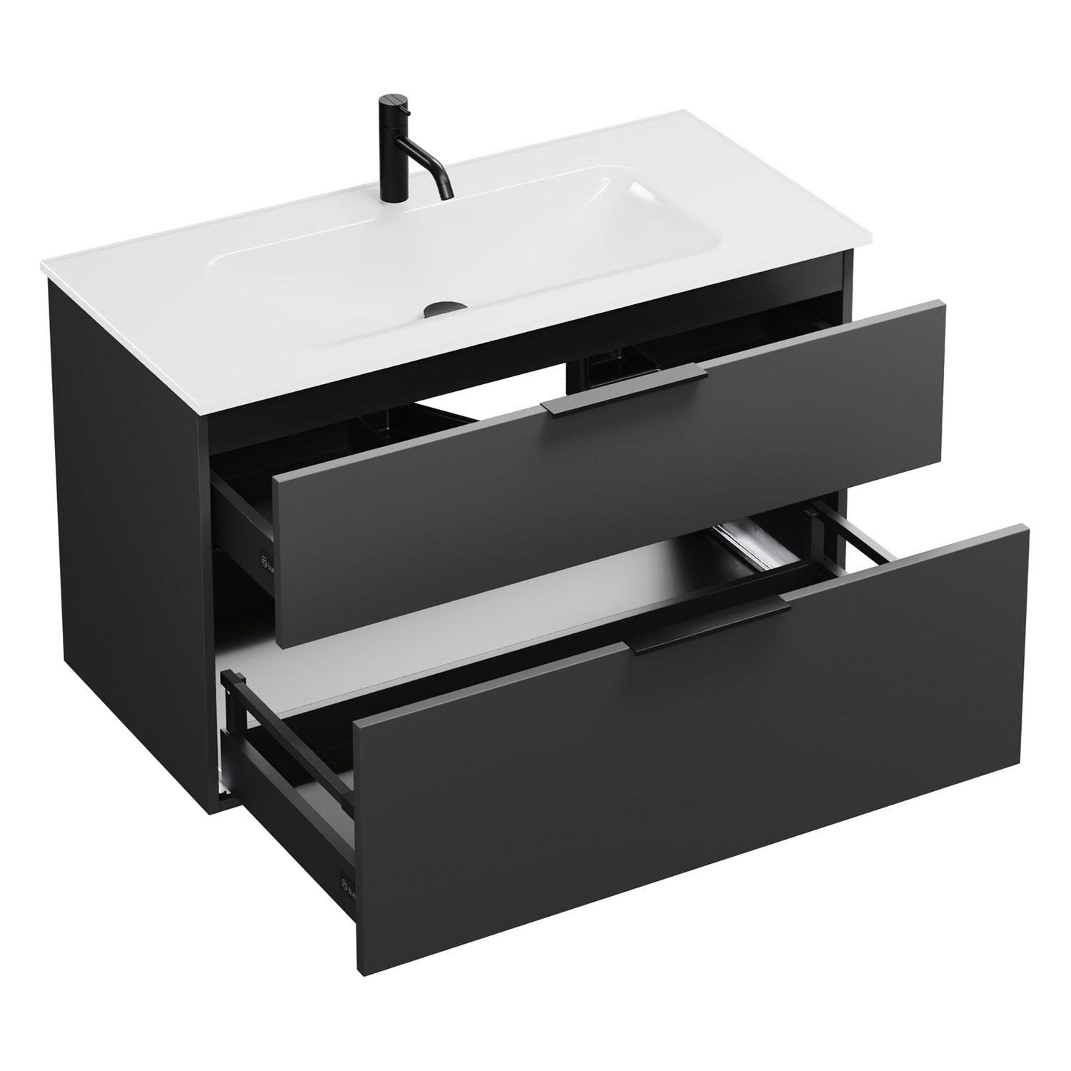 - 1 Schublade oben, 35 cm tief, mit Siphonausschnitt und Inneneinteilung