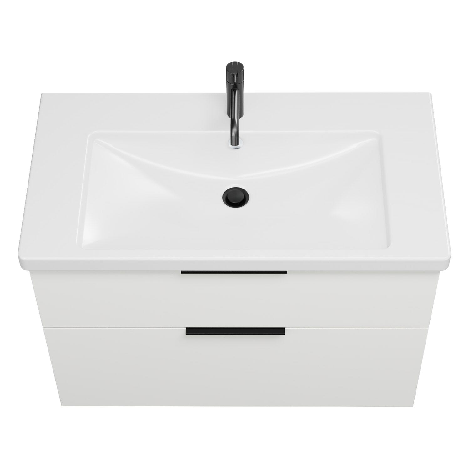 - 1 Schublade oben, 35 cm tief, mit Siphonausschnitt und Inneneinteilung