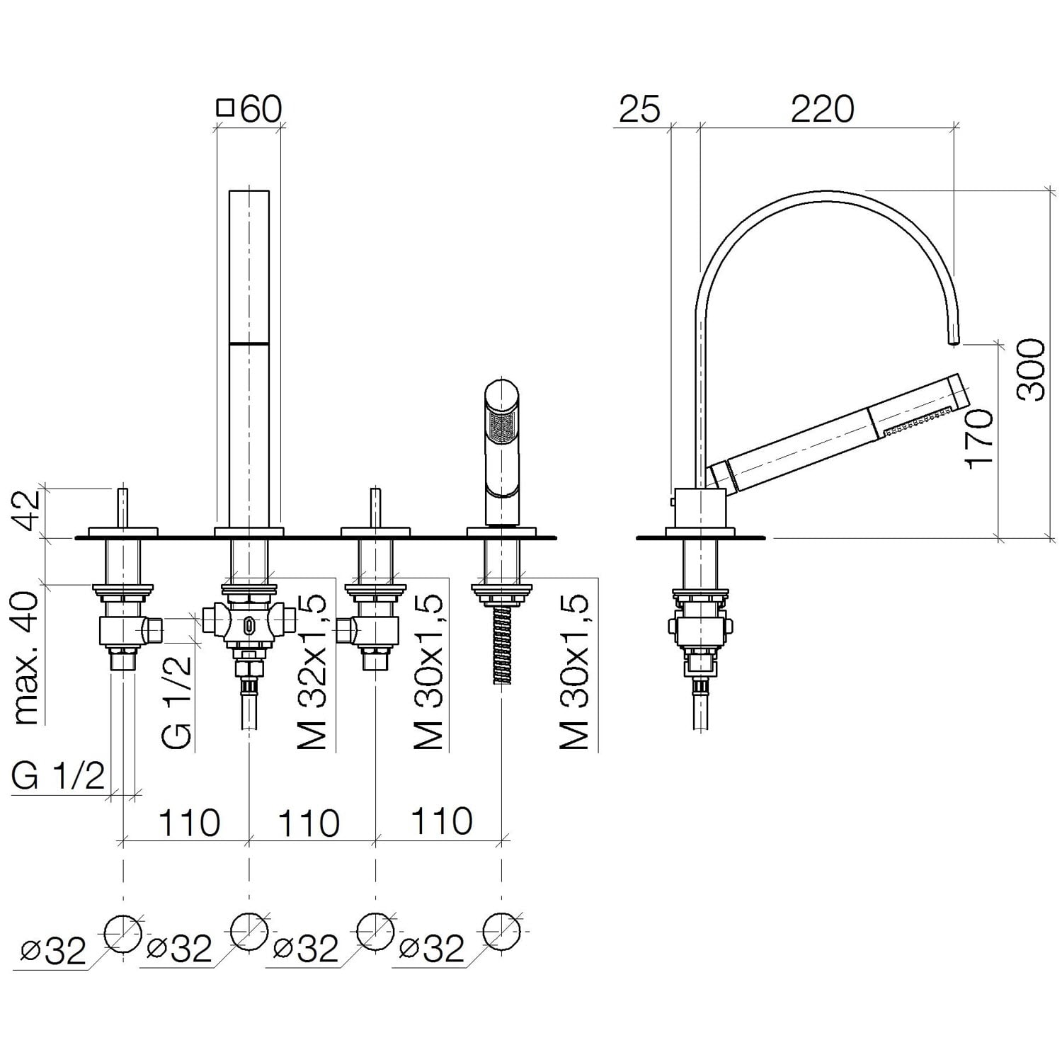 - Bohrungsdurchmesser Seitenventil/Handbrause 3,2 cm