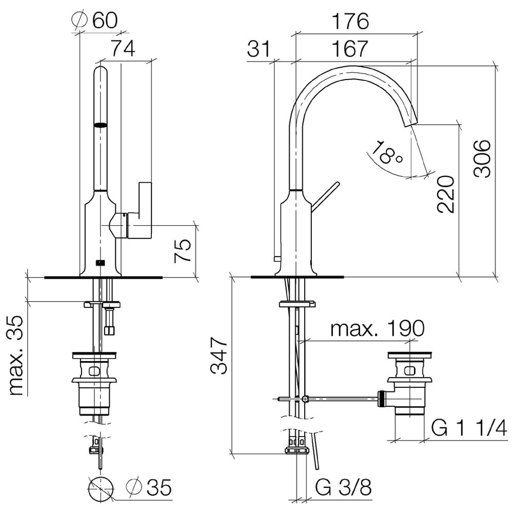 - Höhe bis Luftsprudler 22 cm