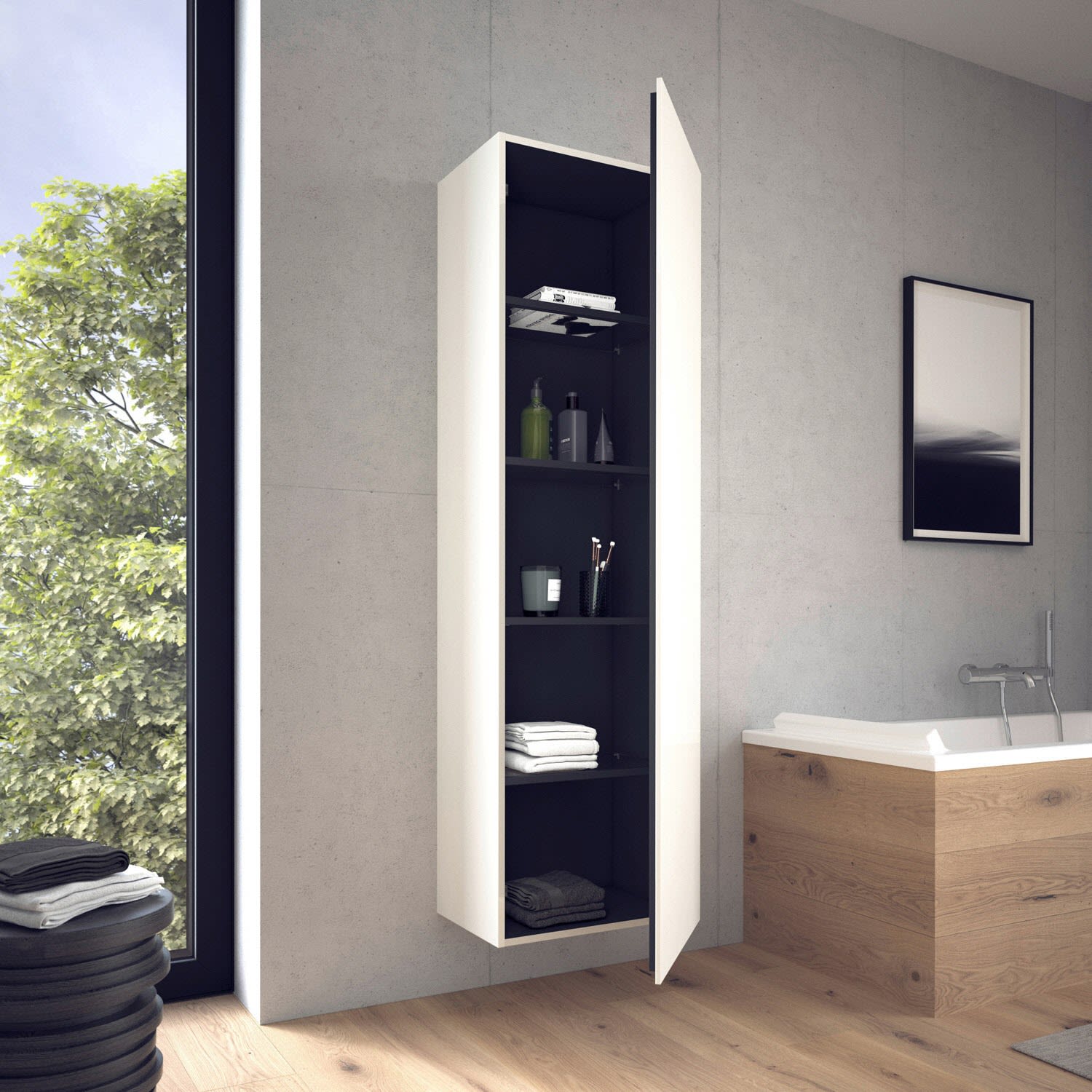 Die Duravit Hochschränke der L-Cube Serie zeichnen sich durch ihr elegantes, minimalistisches Design bei gleichzeitiger Modell-Vielfalt aus: Korpus und Tür (wahlweise mit Türanschlag rechts oder links) sind in 26 Oberflächen als Dekor, Lack oder Echtholzfurnier erhältlich. Sie überzeugen nicht nur mit perfekter Optik und hochwertiger Verarbeitung, sondern ebenso durch feuchteunempfindliches Material und praktische Stauraummöglichkeiten. Innen bieten die Hochschränke vier edle Glasfachböden mit hochwertigem Aluträgersystem, die genügend Platz für die Badutensilien bieten. Da es sie in zwei unterschiedlichen Breiten und Tiefen gibt und sie sowohl wandhängend wie stehend (optional mit zusätzlichen Sockelfüßen) montiert werden können, sind sie leicht an unterschiedlichste Raumanforderungen und Bad Geometrien anpassbar.