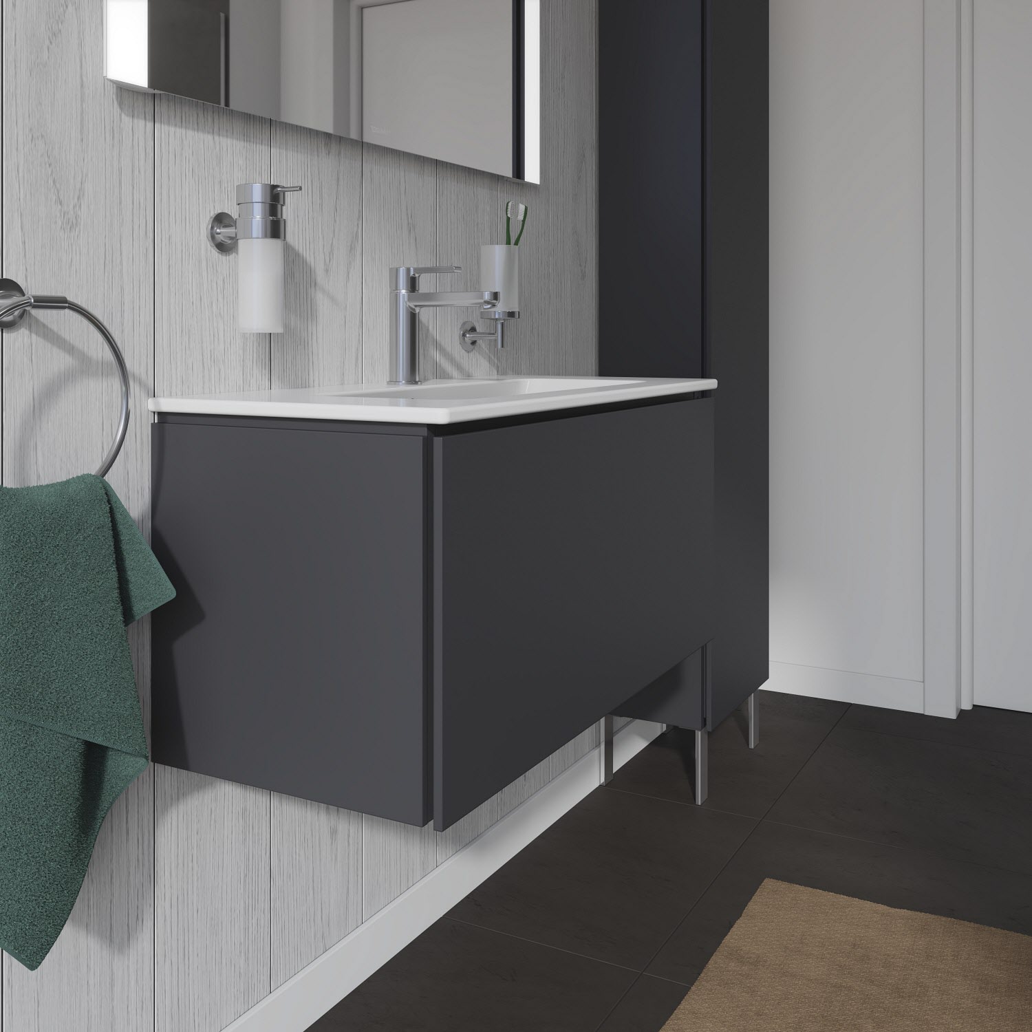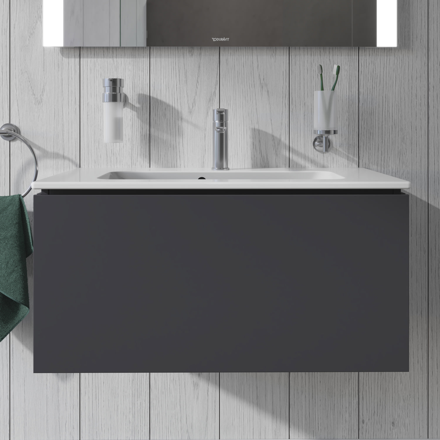 Dieser wandhängende Duravit Waschtischunterbau stammt aus der stilvollen Badmöbel-Reihe L-Cube des Designers Christian Werner. Ein Vollauszug bietet eine hohe Tragfähigkeit (bis 30 kg) und viel praktischen Stauraum. Als Compact-Ausführung ragt der zum ME by Starck Waschtisch #234263 passende Unterschrank nicht so weit in den Raum hinein und ist damit auch für kleine Bäder ideal geeignet. Ein komfortabler Selbsteinzug mit Dämpfung sorgt für ein sanftes Schließen der Schubladen. Das Möbel hat keinen Griff. Mittels Tip-on-Technik öffnet und schließt es sich durch sanften Fingerdruck. Es stehen zahlreiche Farb- und Oberflächengestaltungen von edlen Lacken bis hin zu natürlichen Holzoberflächen zur Auswahl. Dank eines optional integrierbaren, werksseitig verbauten Einrichtungssystems kann der Stauraum bestmöglich organisiert werden. Der Waschtischunterbau wird in sorgfältiger Handarbeit unter Einsatz modernster Technik komplett in Deutschland hergestellt und genügt höchsten Qualitätsansprüchen. Zum Schutz vor dem Eindringen von Wasser und hoher Luftfeuchtigkeit gibt es keine offenen Kanten, der Unterbau ist völlig nässeunempfindlich.