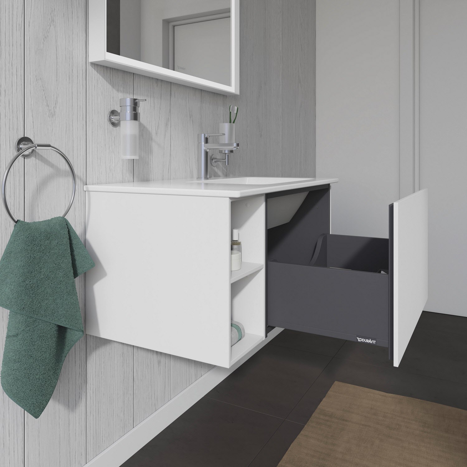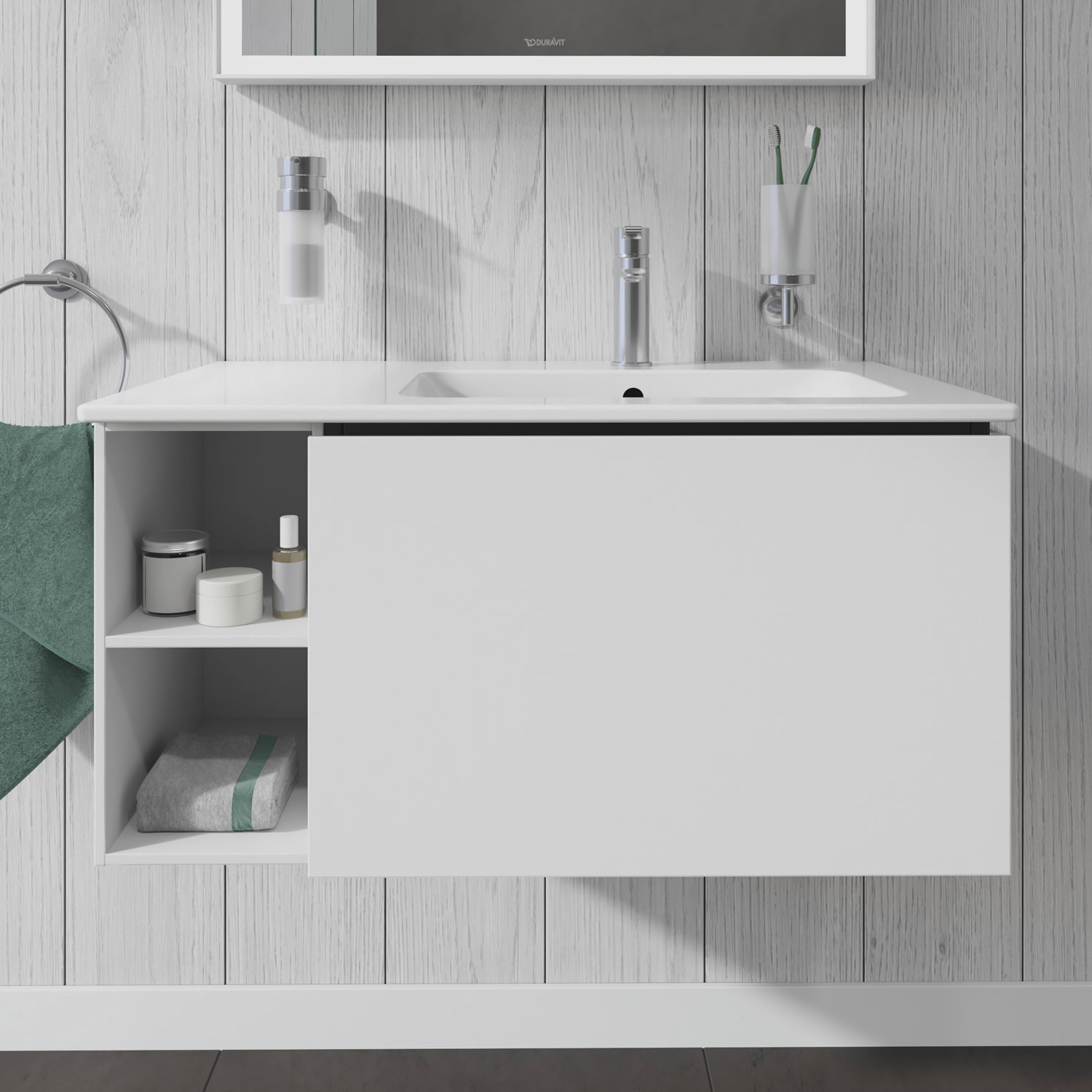 Dieser wandhängende Duravit Waschtischunterbau stammt aus der stilvollen Badmöbel-Reihe L-Cube des Designers Christian Werner. Der Vollauszug bietet eine hohe Tragfähigkeit (bis 30 kg) und viel praktischen Stauraum. Zwei offene Fächer halten weitere Unterbringungsmöglichkeiten bereit. Ein komfortabler Selbsteinzug mit Dämpfung sorgt für sanftes Schließen der Schubladen. Das Möbel hat keinen Griff. Mittels Tip-on-Technik öffnet und schließt es sich durch sanften Fingerdruck. Es stehen zahlreiche Farb- und Oberflächengestaltungen von edlen Lacken bis hin zu natürlichen Holzoberflächen zur Auswahl. Dank eines optional integrierbaren, werksseitig verbauten Einrichtungssystems kann der Stauraum bestmöglich organisiert werden. Der Waschtischunterbau wird in sorgfältiger Handarbeit unter Einsatz modernster Technik komplett in Deutschland hergestellt und genügt höchsten Qualitätsansprüchen. Zum Schutz vor Eindringen von Wasser und hoher Luftfeuchtigkeit gibt es keine offenen Kanten, der Unterbau ist völlig nässeunempfindlich. Er wird komplett vormontiert geliefert.