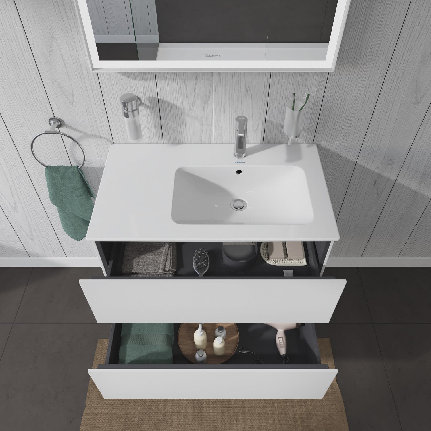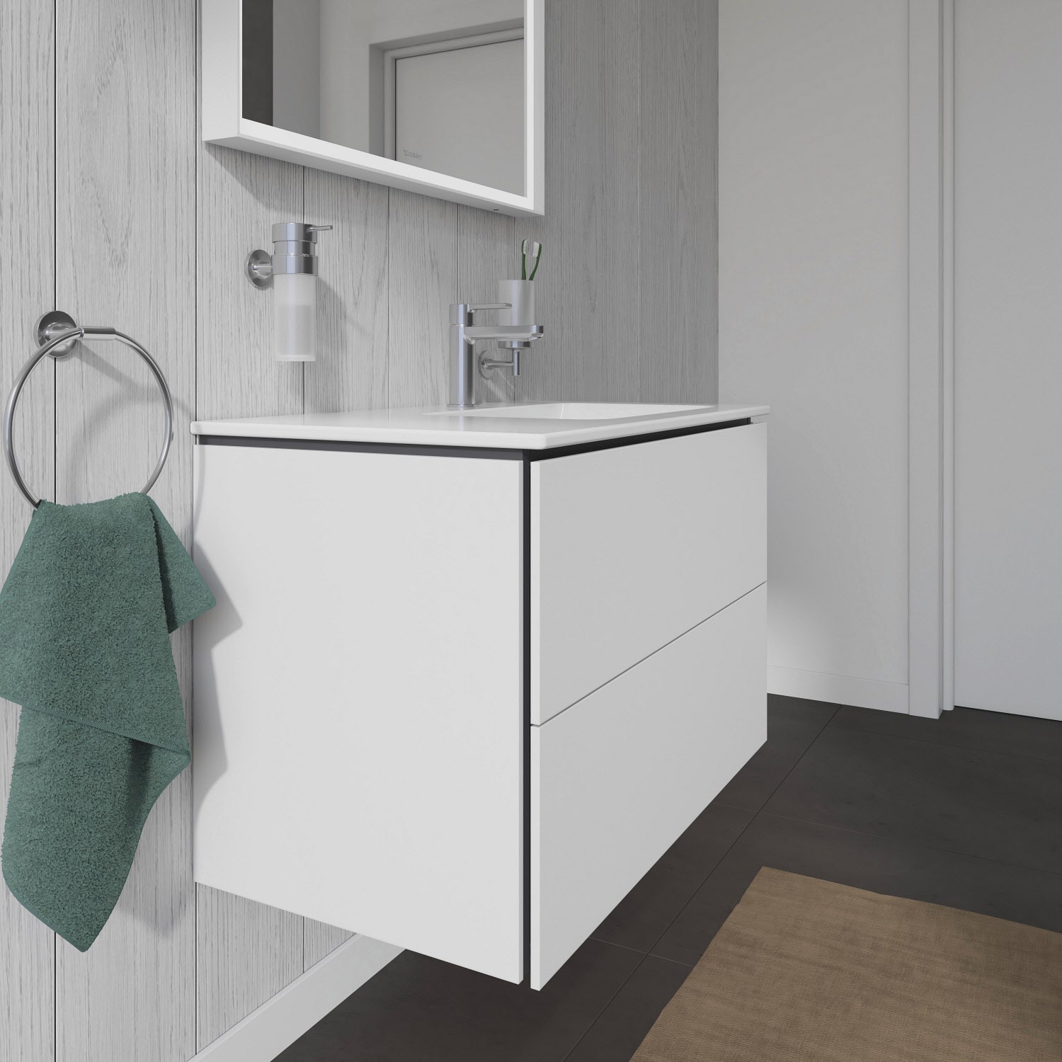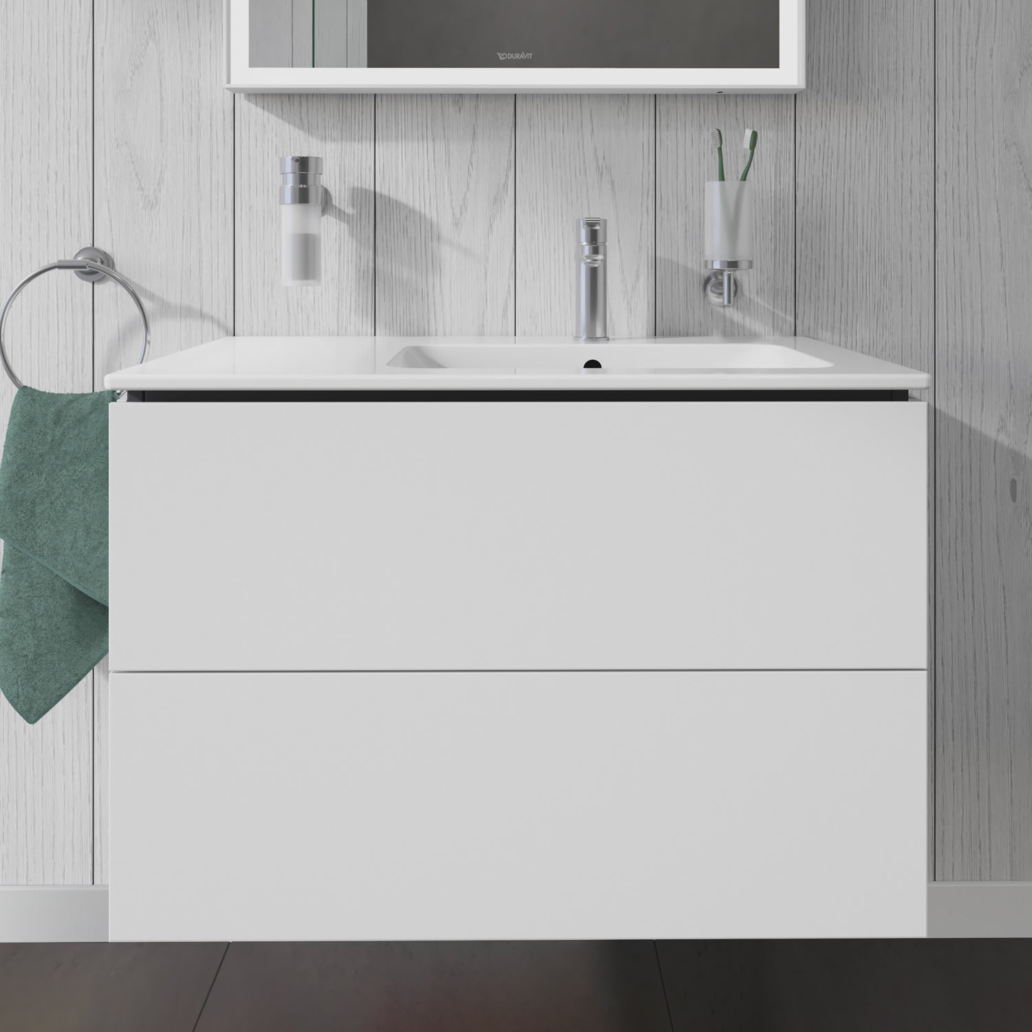 Der wandhängende Duravit L-Cube Waschtischunterschrank passt perfekt zu den Keramikobjekten der ME by Starck Serie von Philippe Starck. Er wird mit modernster Technik und in sorgfältiger Handarbeit komplett in Deutschland gefertigt und erfüllt höchste Qualitätsansprüche. Da er keine offenen Kanten aufweist, zeigt er sich unempfindlich gegen Feuchtigkeit. Sein puristisches Design wirkt klar und elegant – zur individuellen Gestaltung stehen vielfältige Oberflächen, von edlen Lacken bis zu natürlichen Holzdekoren, zur Verfügung. Zwei stabile und tragfähige Vollauszüge bieten viel praktischen Stauraum und lassen sich dank Tip-on-Technik spielend leicht per Fingerdruck öffnen. Sie schließen sanft mit Selbsteinzug und sind dank ihrer grifflosen Gestaltung optimal zu reinigen. Optional kann ein stabiles, gut durchdachtes Einrichtungssystem im Innern der Schublade integriert werden, welches alle Bad-Utensilien an ihrem Platz hält und Ordnung schafft.