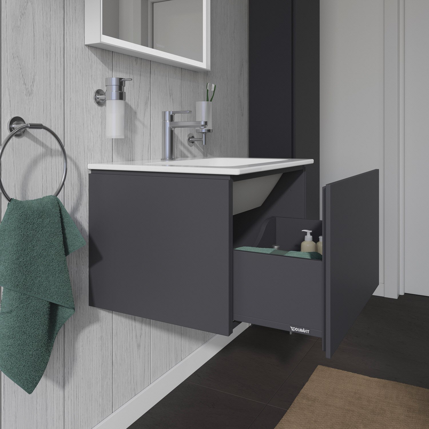 Dieser wandhängende Duravit Waschtischunterbau stammt aus der stilvollen Badmöbel-Reihe L-Cube des Designers Christian Werner. Ein Vollauszug bietet eine hohe Tragfähigkeit (bis 30 kg) und viel praktischen Stauraum. Ein komfortabler Selbsteinzug mit Dämpfung sorgt für ein sanftes Schließen der Schubladen. Das Möbel hat keinen Griff. Mittels Tip-on-Technik öffnet und schließt es sich durch sanften Fingerdruck. Es stehen zahlreiche Farb- und Oberflächengestaltungen von edlen Lacken bis hin zu natürlichen Holzoberflächen zur Auswahl. Dank eines optional integrierbaren, werksseitig verbauten Einrichtungssystems kann der Stauraum bestmöglich organisiert werden. Der Waschtischunterbau wird in sorgfältiger Handarbeit unter Einsatz modernster Technik komplett in Deutschland hergestellt und genügt höchsten Qualitätsansprüchen. Zum Schutz vor dem Eindringen von Wasser und hoher Luftfeuchtigkeit gibt es keine offenen Kanten, der Unterbau ist völlig nässeunempfindlich.