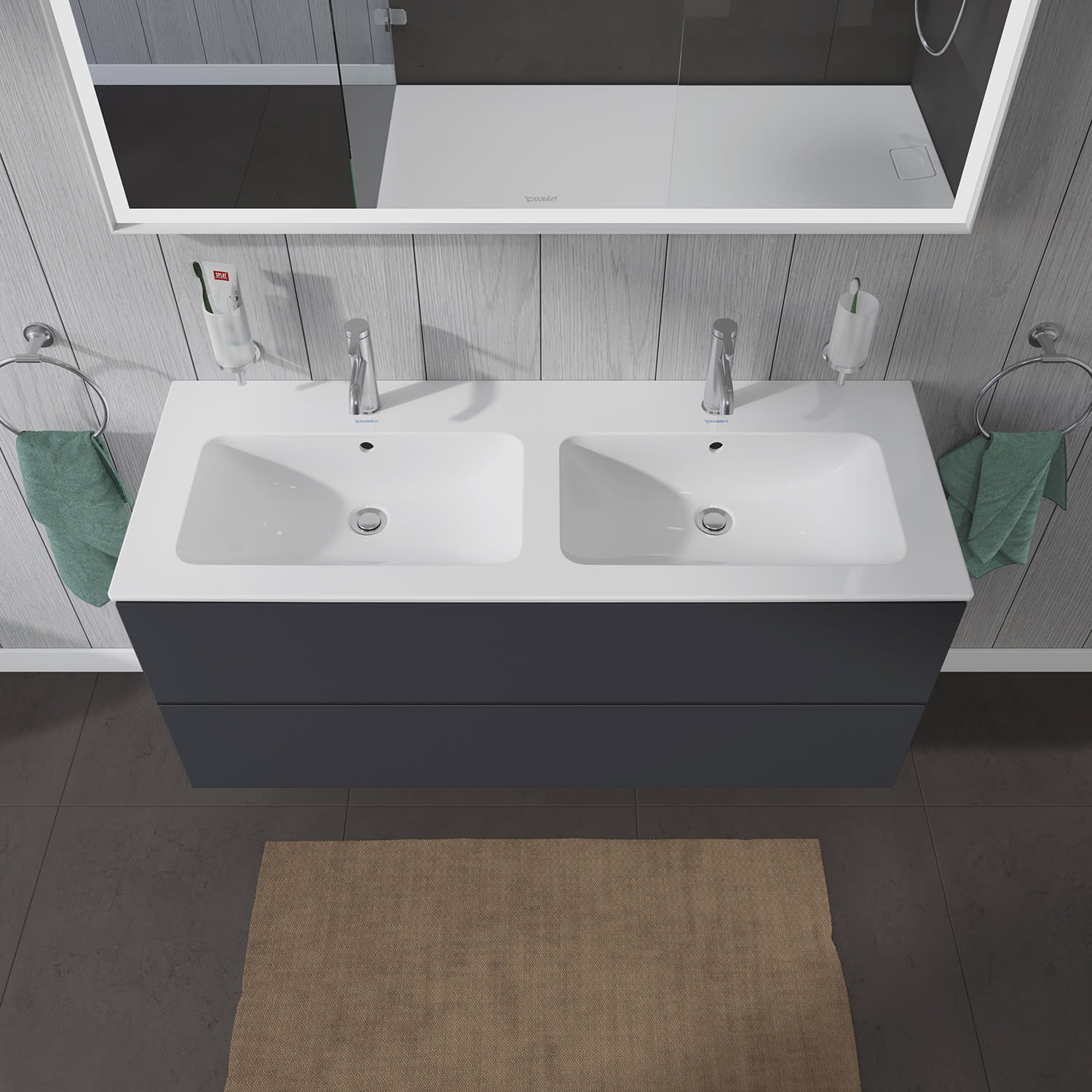 Dieser wandhängende Duravit-Waschtischunterbau für das ME by Starck Doppelwaschbecken (#233613) stammt aus der stilvollen Badmöbel-Reihe L-Cube des Designers Christian Werner und bietet genügend Platz für die gleichzeitige Nutzung zu zweit. Zwei Schubkästen als Vollauszug bieten eine hohe Tragfähigkeit (bis 30 kg) und viel praktischen Stauraum. Ein komfortabler Selbsteinzug mit Dämpfung sorgt für sanftes Schließen der Schubladen. Das Möbel hat keinen Griff, mittels Tip-on-Technik öffnet und schließt es sich durch sanften Fingerdruck. Es stehen zahlreiche Farb- und Oberflächengestaltungen von edlen Lacken bis hin zu natürlichen Holzoberflächen zur Auswahl.