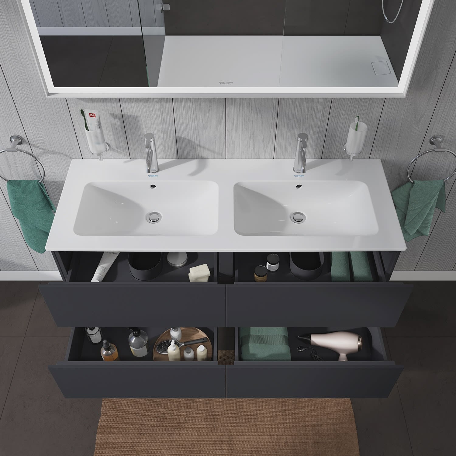 Dieser wandhängende Duravit-Waschtischunterbau für das ME by Starck Doppelwaschbecken (#233613) stammt aus der stilvollen Badmöbel-Reihe L-Cube des Designers Christian Werner. Vier Schubkästen als Vollauszug bieten eine hohe Tragfähigkeit (bis 30 kg) und viel praktischen Stauraum. Ein komfortabler Selbsteinzug mit Dämpfung sorgt für ein sanftes Öffnen und Schließen der Schubladen. Das Möbel hat keinen Griff, mittels Tip-on-Technik öffnet und schließt es sich durch sanften Fingerdruck. Es stehen zahlreiche Farb- und Oberflächengestaltungen von edlen Lacken bis hin zu natürlichen Holzoberflächen zur Auswahl. Dank eines optional integrierbaren, werksseitig verbauten Einrichtungssystems kann der Stauraum bestmöglich organisiert werden.