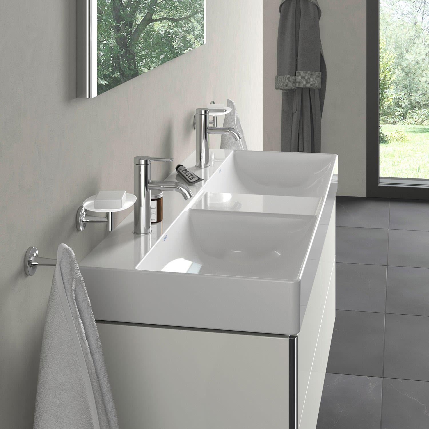 Mit dem Duravit DuraSquare Doppelwaschtisch schaffen Sie im Nu einen ästhetischen und kommunikativen Mittelpunkt im Bad! Der markante Waschtisch mit industriellem Charme zeigt weiche Übergänge und filigrane Wandstärken – dank des innovativen Materials DuraCeram®: einer speziellen Keramikmasse, die äußerst robust, kratzfest und hygienisch ist. Optional sorgt die spezielle wasserabweisende WonderGliss Keramikbeschichtung für besonders leichte Reinigung. Eine großzügige, durchgängige Hahnlochbank bietet ausreichend Platz für zwei schicke Waschtischarmaturen und bildet zusammen mit dem breiten Mittelsteg zwischen den beiden Becken nützliche Ablageflächen. Weiteres optisches Highlight sind die nicht verschließbaren, kreisrunden Ablaufventile mit keramischer Abdeckung, die zu einer eleganten Einheit mit dem Becken verschmelzen. Dank der hygienischen Rundum-Glasierung eignet sich der Waschtisch ebenso hervorragend zur wandhängenden Einzelmontage wie auch zur Montage auf den passenden Duravit Waschtischunterschränken oder Metallkonsolen. Als stilsicheres Zubehör bieten sich bei der Einzelmontage der passende DuraSquare Handtuchhalter sowie ein eleganter Design-Siphon an.