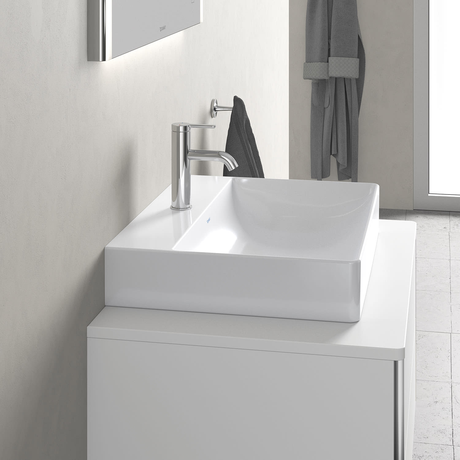 Das DuraSquare Waschtisch ist aus der innovativen und speziell entwickelten Keramikmasse DuraCeram® gefertigt. Dieses äußerst kratzfeste und pflegeleichte Material mit hohem Härtegrad und edlem Finish ermöglicht filigrane Formen mit extrem dünnen Wandstärken. Der Waschtisch verbindet optische und funktionale Vorteile, z.B. durch sein nicht verschließbares Ablaufventil mit keramischer Abdeckung in Beckenfarbe. Becken und Ventil verschmelzen harmonisch zu einer ästhetischen Einheit.
