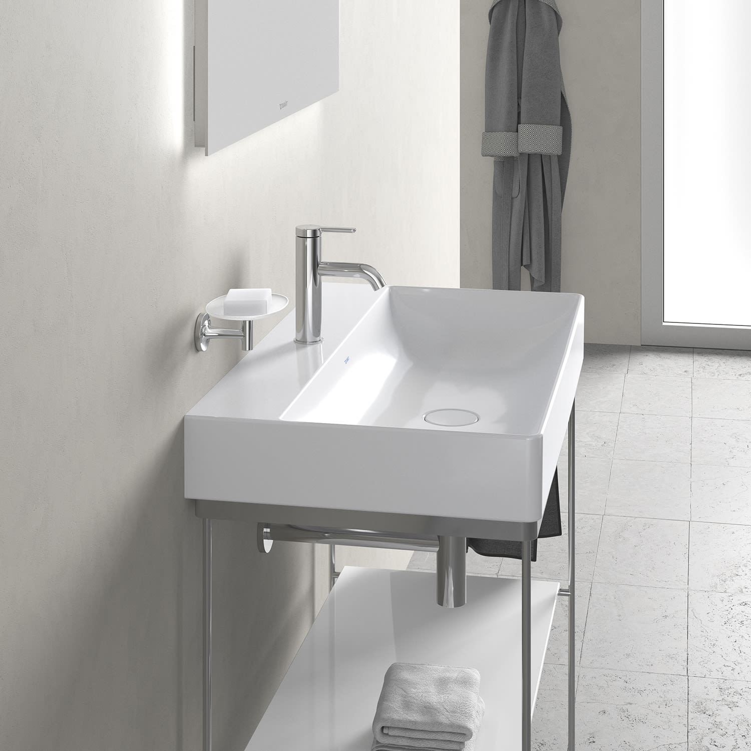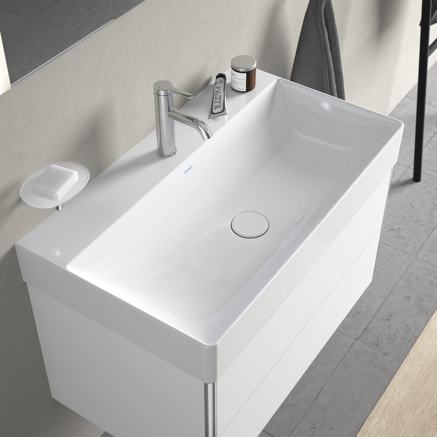 Das DuraSquare Waschtisch ist aus der innovativen und speziell entwickelten Keramikmasse DuraCeram® gefertigt. Dieses äußerst kratzfeste und pflegeleichte Material mit hohem Härtegrad und edlem Finish ermöglicht filigrane Formen mit extrem dünnen Wandstärken. Der Waschtisch verbindet optische und funktionale Vorteile, z.B. durch sein nicht verschließbares Ablaufventil mit keramischer Abdeckung in Beckenfarbe. Becken und Ventil verschmelzen harmonisch zu einer ästhetischen Einheit.