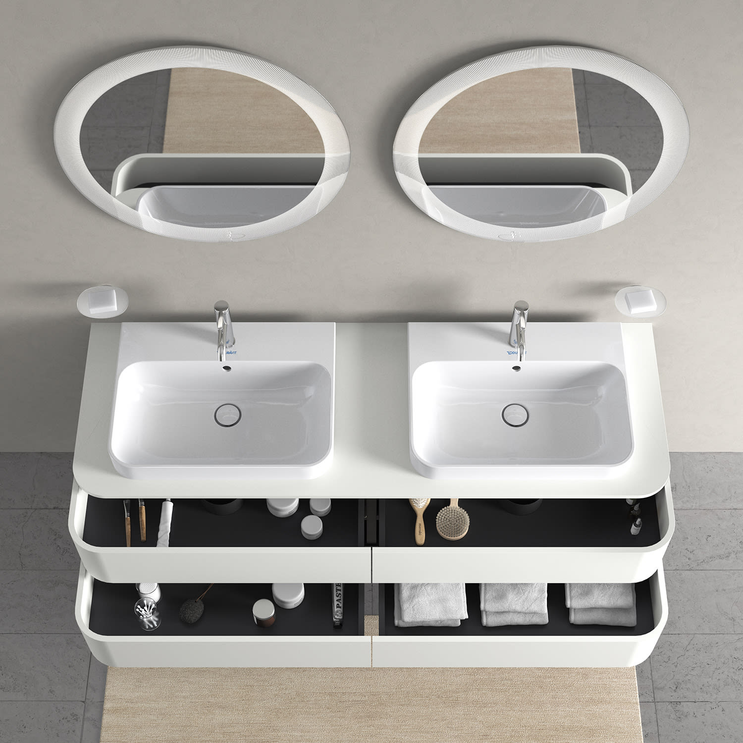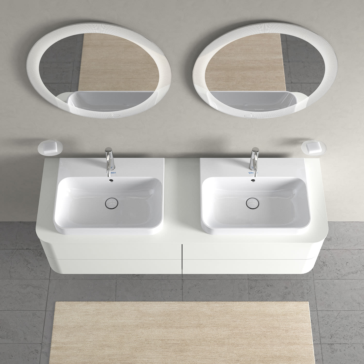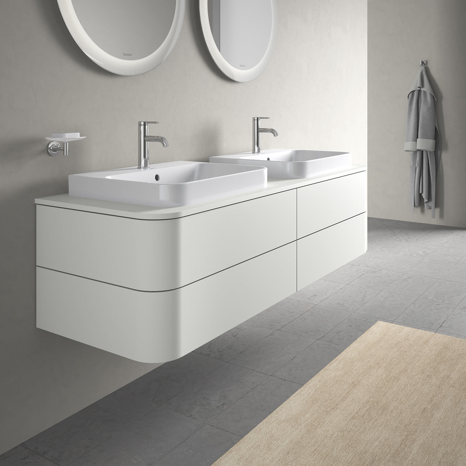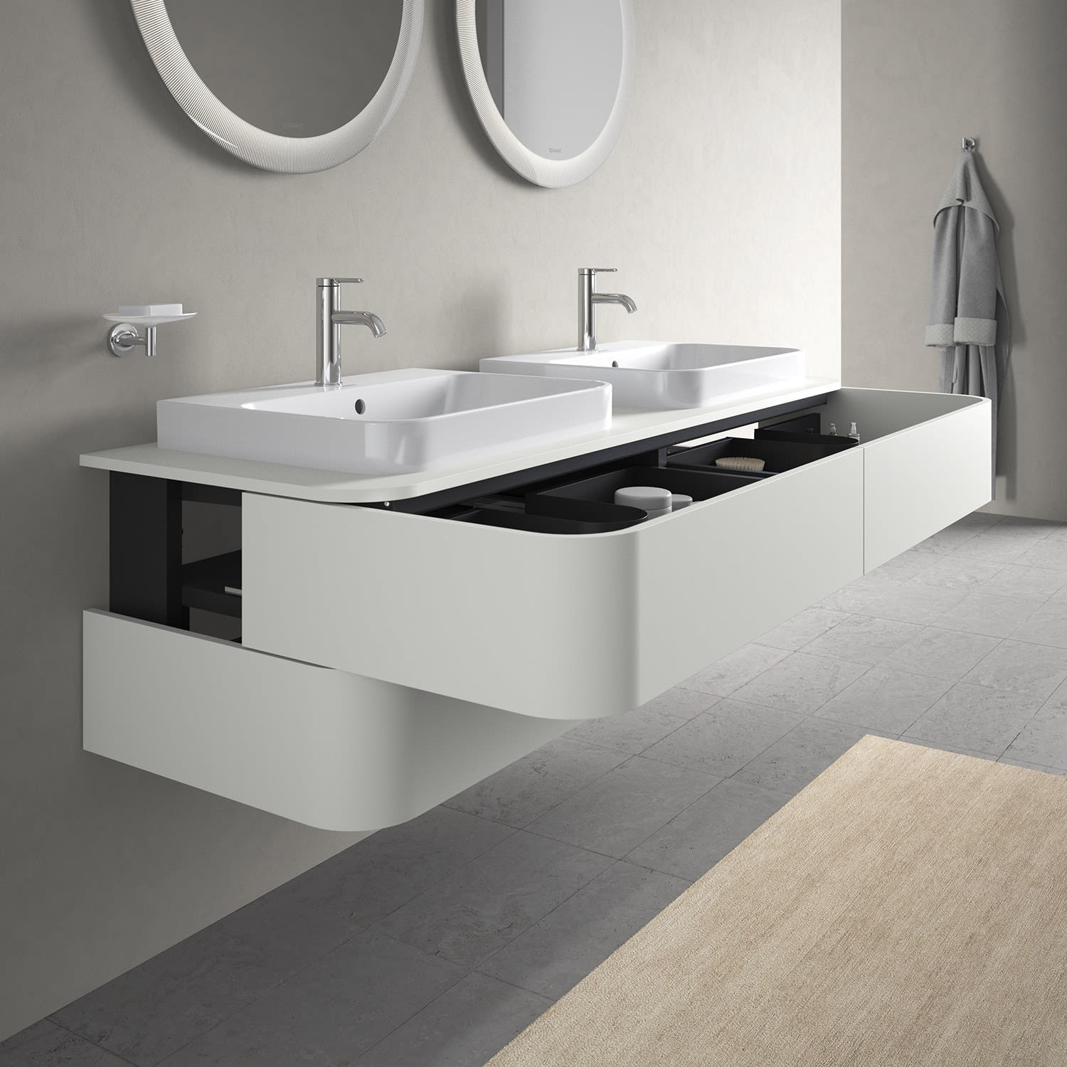 Der wandhängende Konsolenwaschtischunterbau mit zwei Waschplätzen aus der Happy D.2 Plus Serie by sieger design präsentiert sich minimalistisch elegant und ermöglicht zahlreiche individuelle Kombinationen mit verschiedenen Aufsatzbecken dieser Serie – maximale Flexibilität ohne Kompromisse im Design, auch dank einer großen Auswahl an Oberflächen- und Farbgestaltungen. Die sanft abgerundeten Ecken des Möbels setzen sich konsequent in den passenden Waschtischen und Konsolenplatten fort.