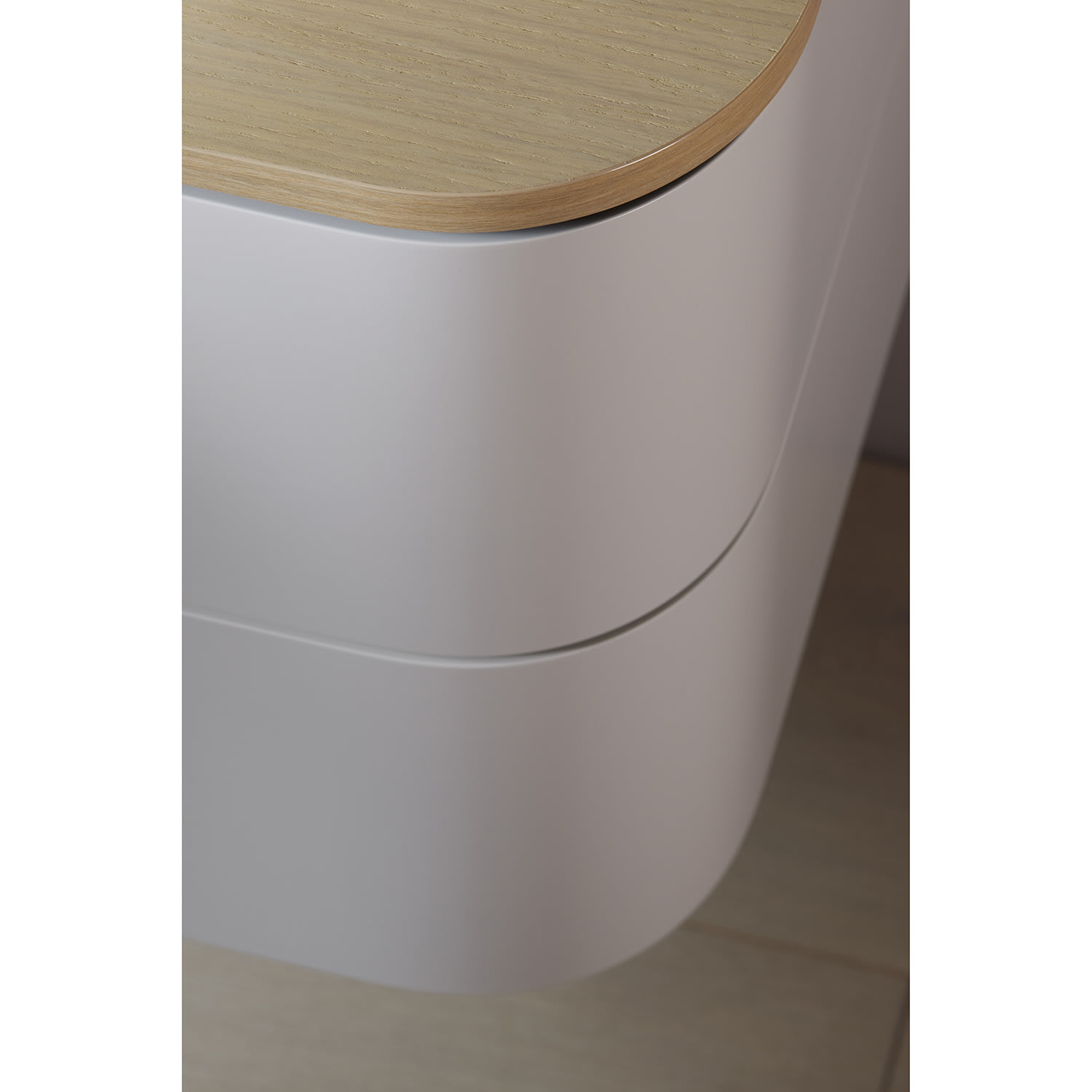 Dank Tip-on-Technik sind die vier Schubfächer grifflos gestaltet, der komfortable Selbsteinzug mit Dämpfung sorgt für ein sanftes Schließen. Gleichzeitig bieten die Schubfächer viel nützlichen Stauraum und überzeugen durch den praktischen Vollauszug sowie durch ihre hohe Tragfähigkeit von 30 kg.Werkseitig kann optional ein smartes Einrichtungssystem aus Massivholz verbaut werden. Die hochwertige Verarbeitung des Möbels bietet zudem effektiven Schutz vor Spritzwasser und hoher Luftfeuchtigkeit.