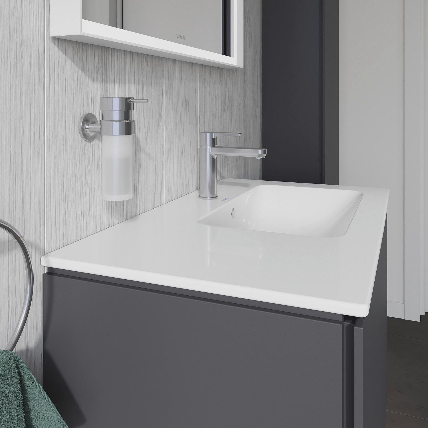 Dieser Duravit-Waschtisch mit einem Waschplatz stammt aus der Design-Serie ME by Starck von Philippe Starck. Die hochwertige Sanitärkeramik überzeugt nicht nur mit ihrem edlen Design, sondern auch durch ihre Widerstandsfähigkeit und Kratzresistenz. Darüber hinaus weist das Keramikmaterial einen hohen Härtegrad auf. Die reinigungsfreundliche und hygienische Oberfläche sieht nicht nur glänzend aus, sie ist auch pflegeleicht. Der Waschtisch ist zudem mit der optionalen wasserabweisenden WonderGliss Beschichtung erhältlich – für eine besonders einfache Reinigung und noch mehr Komfort. Das asymmetrisch platzierte Becken verleiht diesem ästhetischen Waschtisch eine großzügige Ablagefläche. Dieser Waschtisch ist auch in Seidenmatt erhältlich. Der wandhängende Waschtisch fügt sich bei Montage mit anderen Badezimmermöbeln bestens ins Gesamtbild ein. Er hat einen Überlauf und eine Hahnlochbank.