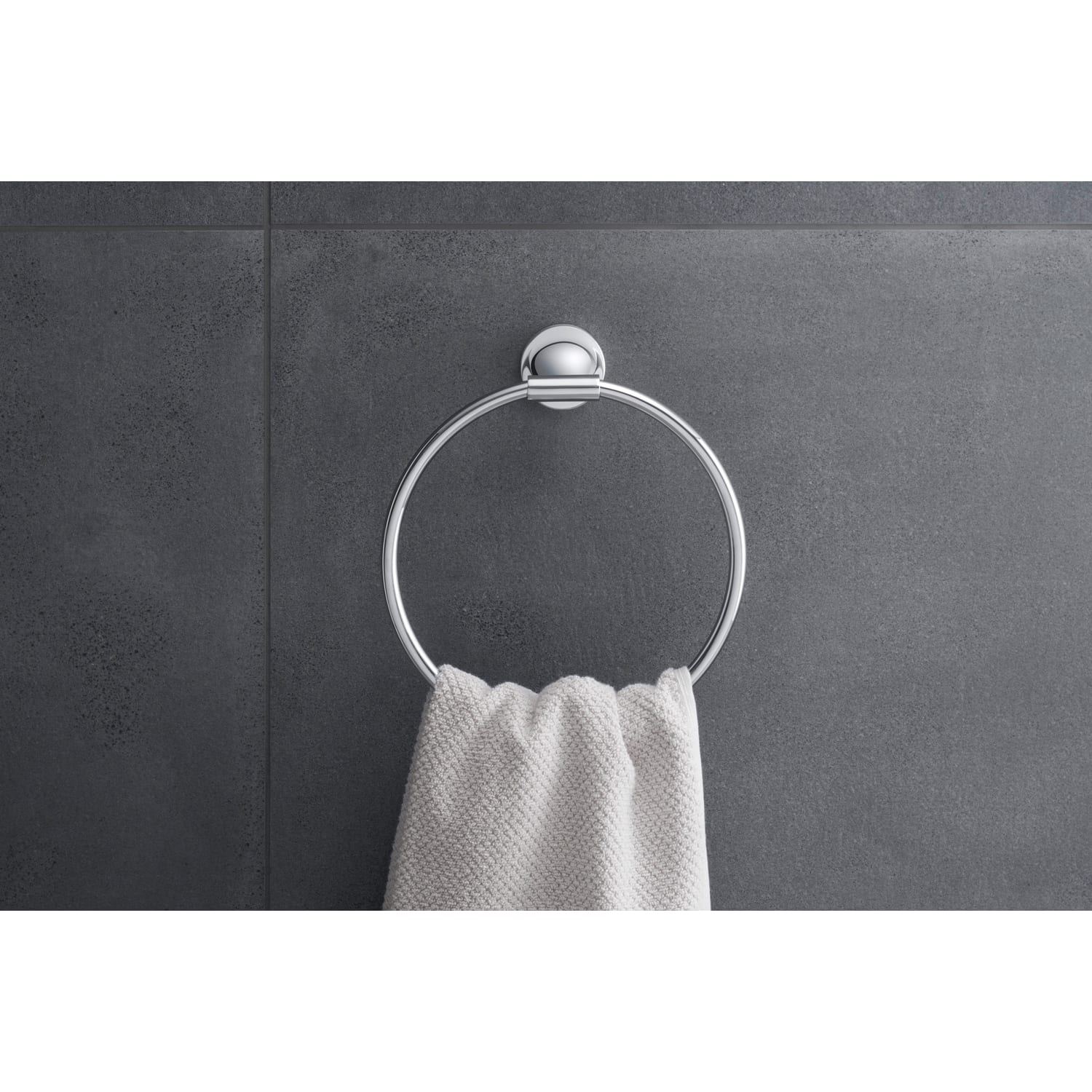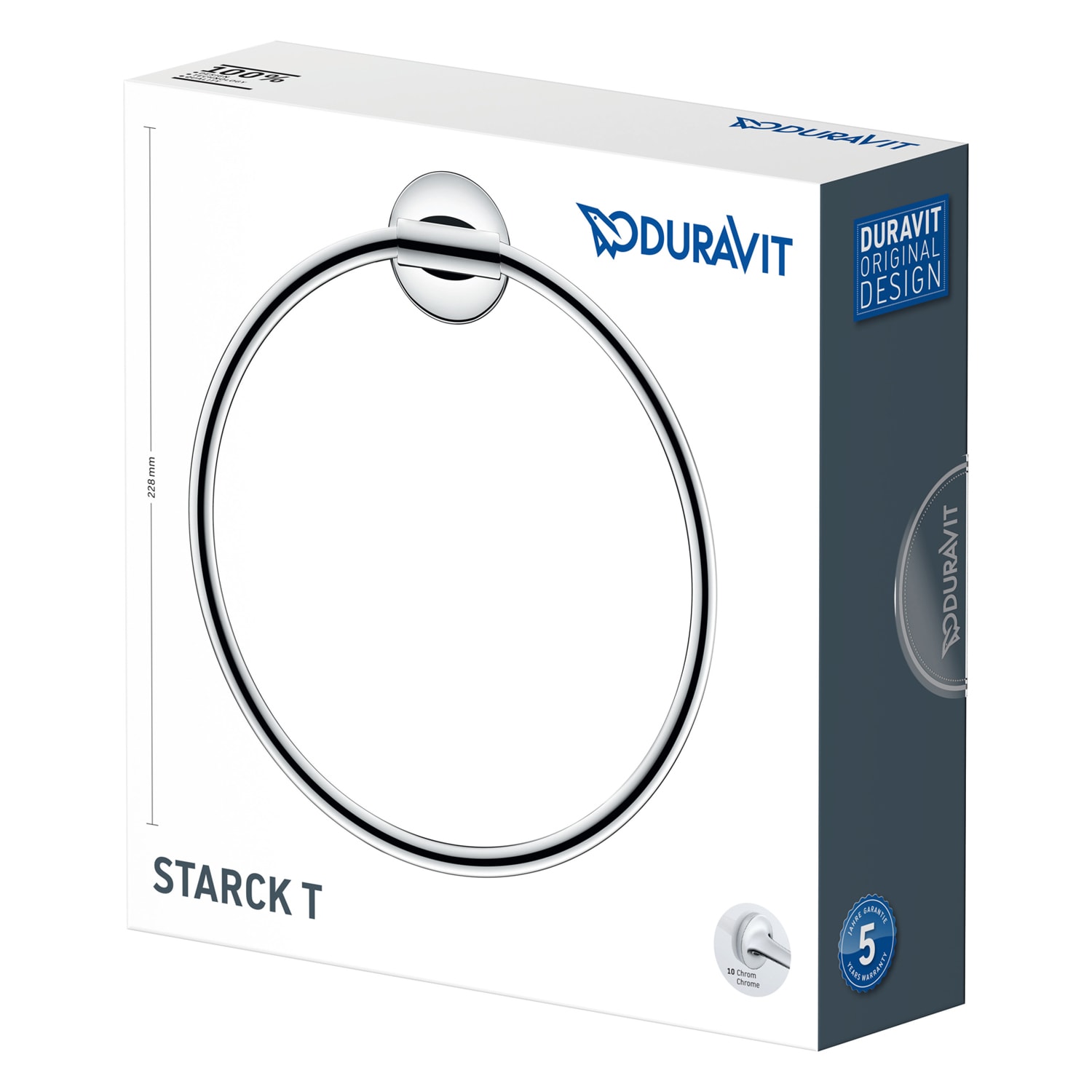 Markanter Blickpunkt in perfekter Gestaltung: der Duravit Starck T Handtuchring zeigt sich als formvollendetes Statement-Accessoire im modernen Designbad! Philippe Starcks bildhafte Gestaltungsidee eines sich verästelnden Baumes findet sich auch in diesem stilvollen, kreisförmigen Handtuchhalter wieder, dessen „T“-förmige Halterung einer runden, wandhängenden Basis entspringt und einen um 180° schwenkbaren Metallring trägt, der Hand- und Gästetücher jeden Formats komfortabel griffbereit hält. Seine hochwertige Verarbeitung und stringente Funktionalität kennzeichnen dieses edle Badobjekt ebenso wie das verdeckte Befestigungssystem, welches die elegante Optik gelungen unterstreicht. Praktisch: Der Handtuchring kann sowohl an die Wand geschraubt als auch geklebt werden und lässt sich ideal mit weiteren Badaccessoires aus der Starck T Designlinie kombinieren.