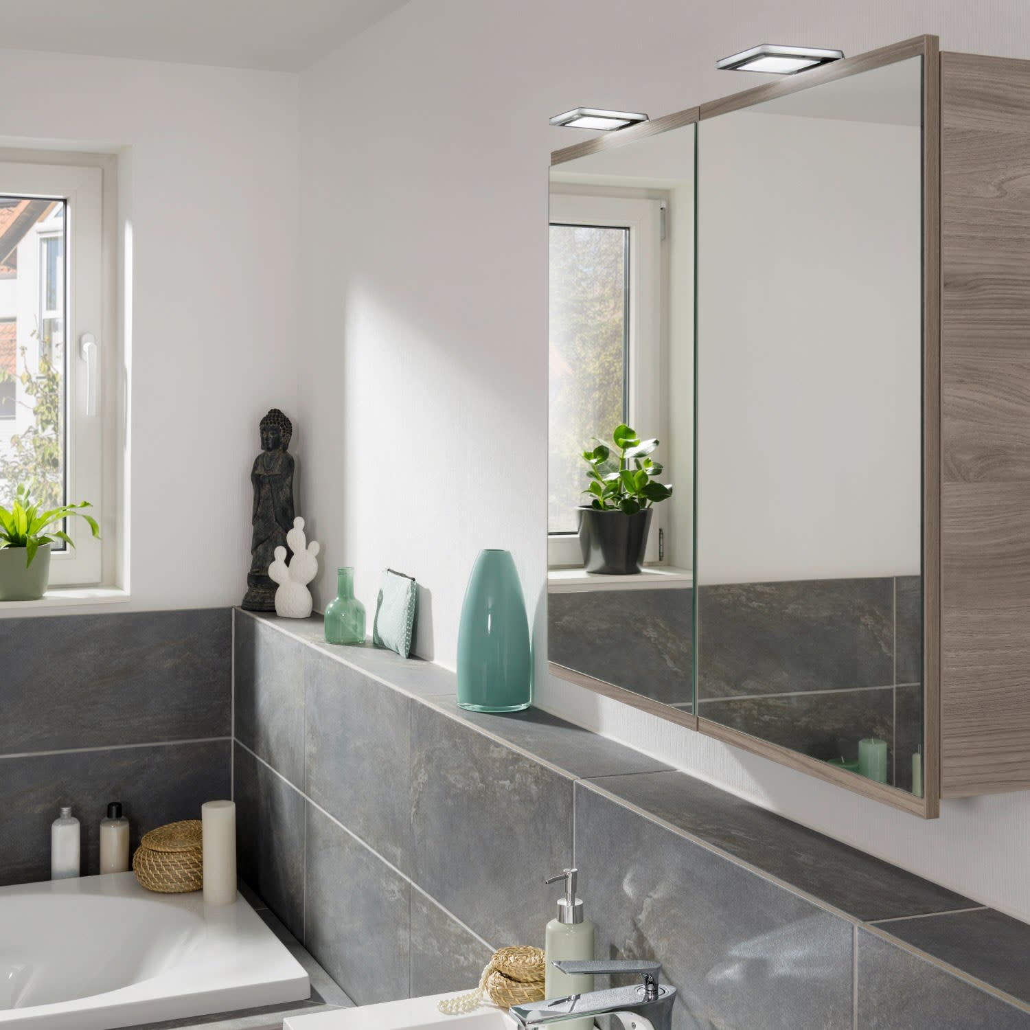 - mit 2 LED Aufsatzleuchten oben (1x mittig je Tür)