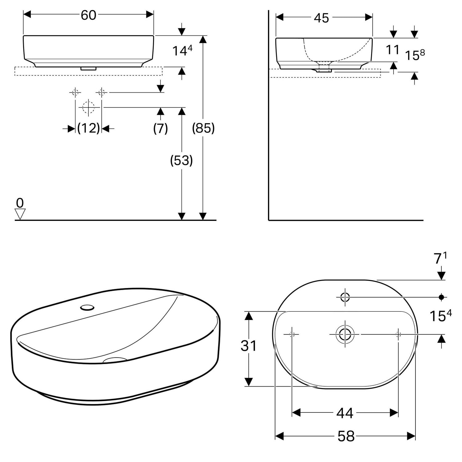Geberit VariForm Aufsatzwaschtisch 60 x 45 cm, elliptisch, mit Hahnlochbank