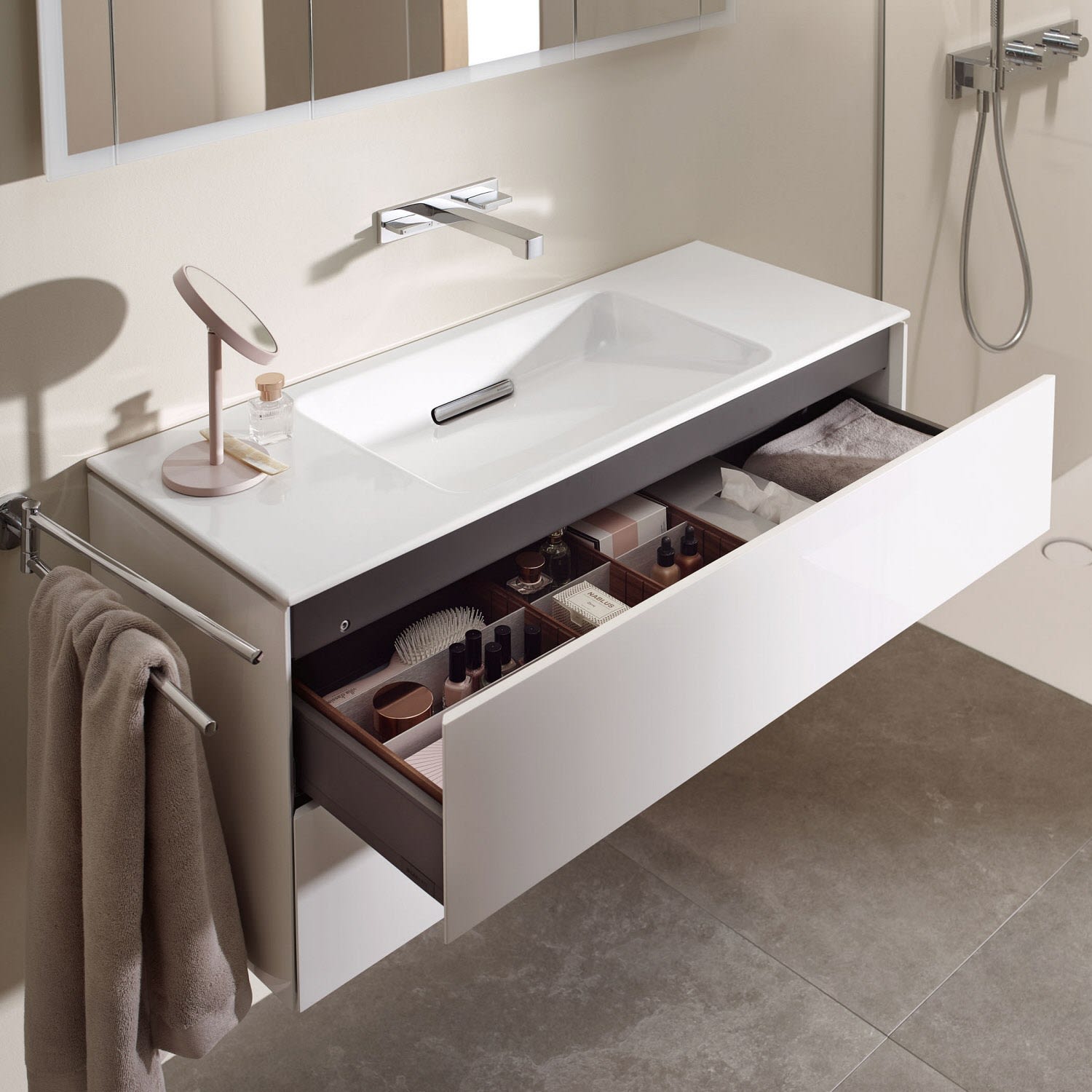 - komplett nutzbarer Stauraum in oberer Schublade