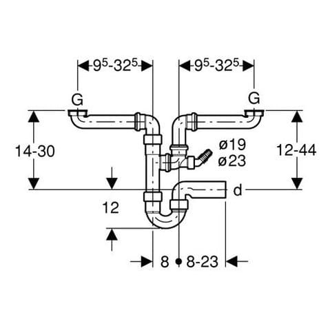 Geberit Spültisch-Ablauf DN 50 für zwei Becken, Raumsparmodell