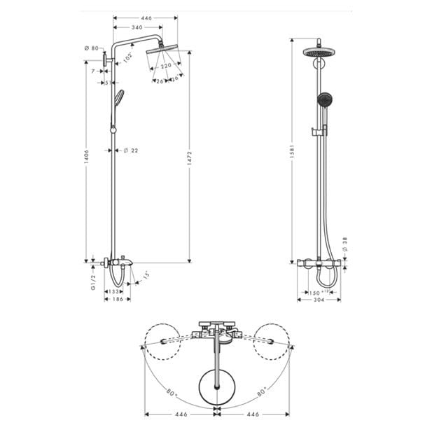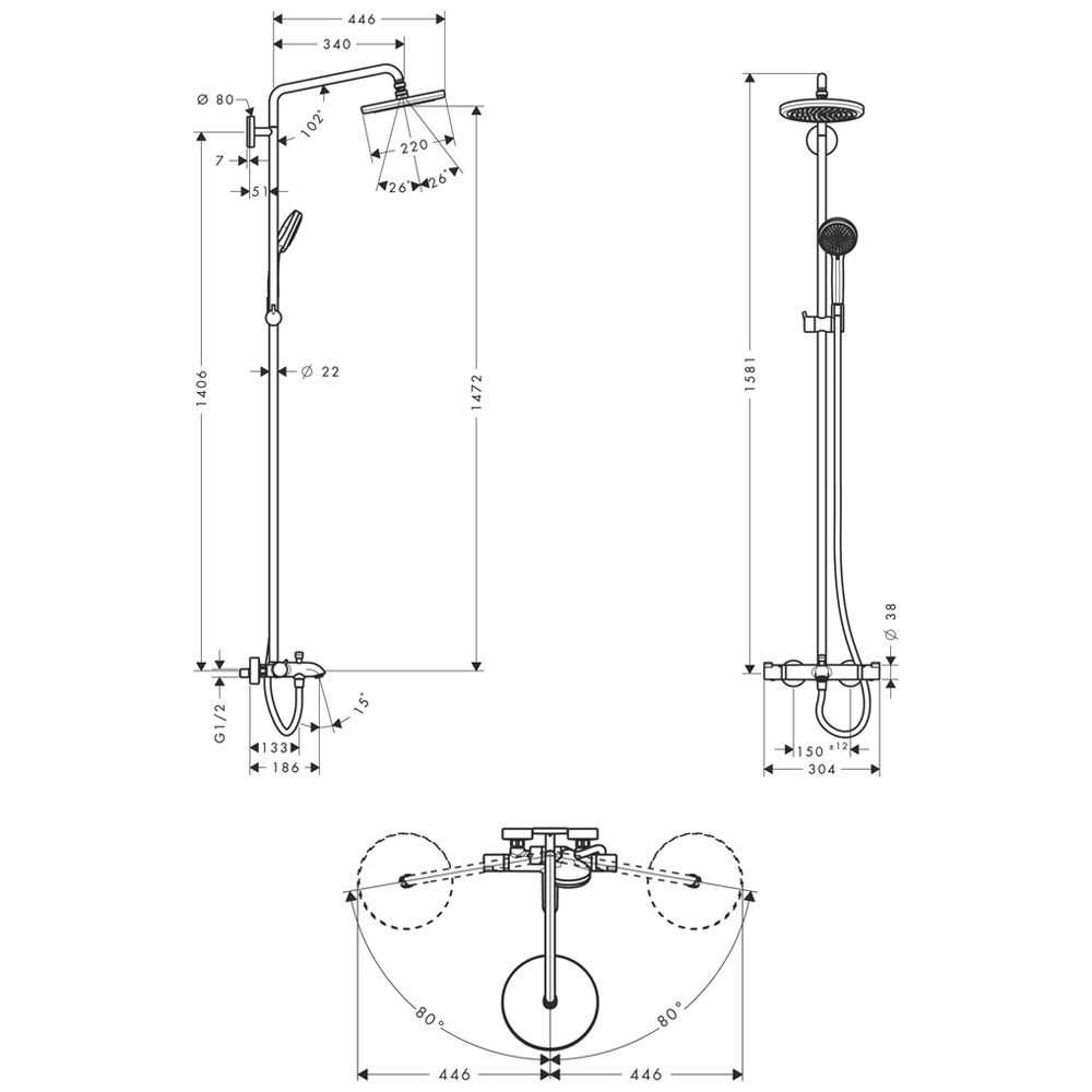 hansgrohe Croma 220 Showerpipe Wanne mit Brausearm 40 cm, schwenkbar