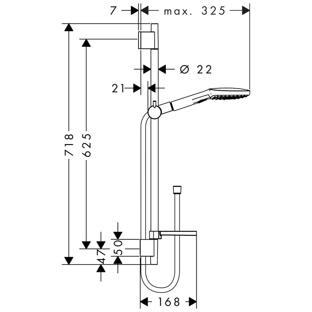 - Besteht aus: Handbrause, Brausestange, Brauseschlauch, Schieber, Seifenschale